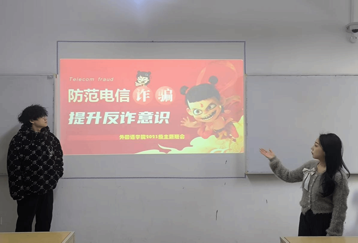 为提升学生反诈意识,紧绷防范之心,筑牢学院安全防线。外国语学院于11月26日组织2023级各班开展了以反诈为主题的班会活动,本次活动由2023级辅导员林薪宜以及各班班长主持,2023级全体同学参加。