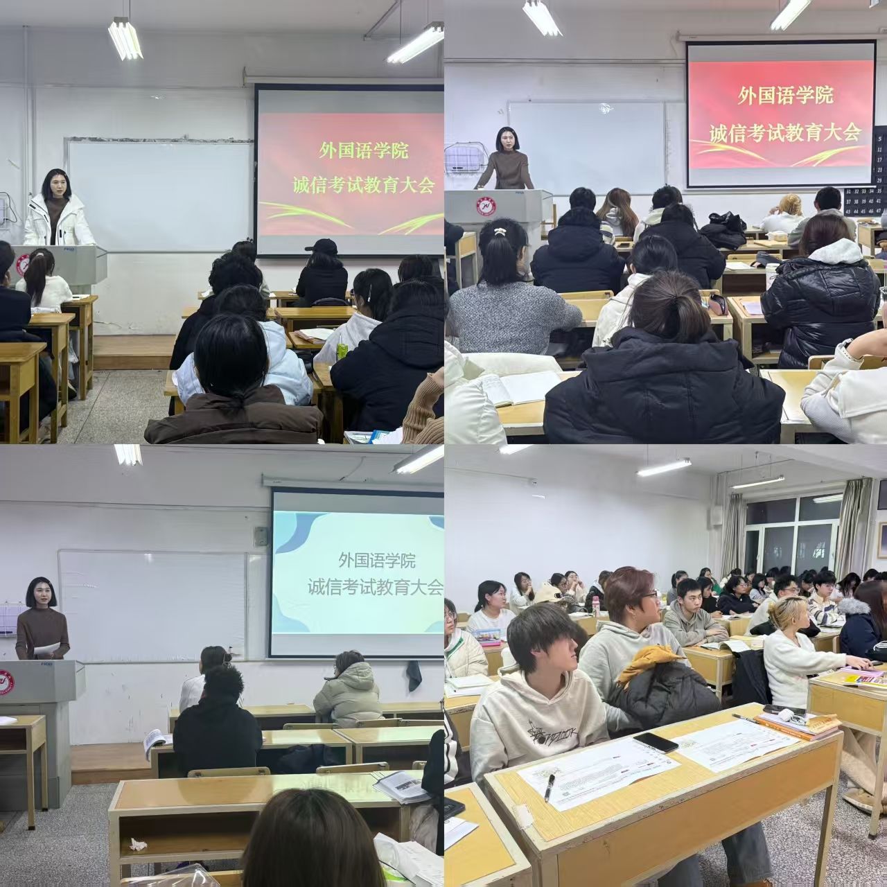 会上,张志涛以“诚信立身,自律成才”为主题向广大同学提出考试要求,他强调,诚信是大学生最基本的道德规范和行为准则,是个人品格和综合素质的重要体现。张志涛结合外语专业特点和学生成长规律指出,严谨求实的治学态度、诚实守信的品行修养直接关系到同学们的专业发展和长远成长。他要求全体学生深刻认识诚信应考的重要性,端正学习态度,自觉遵守各项规章制度,培养良好的自我管理能力,为未来发展奠定坚实基础。