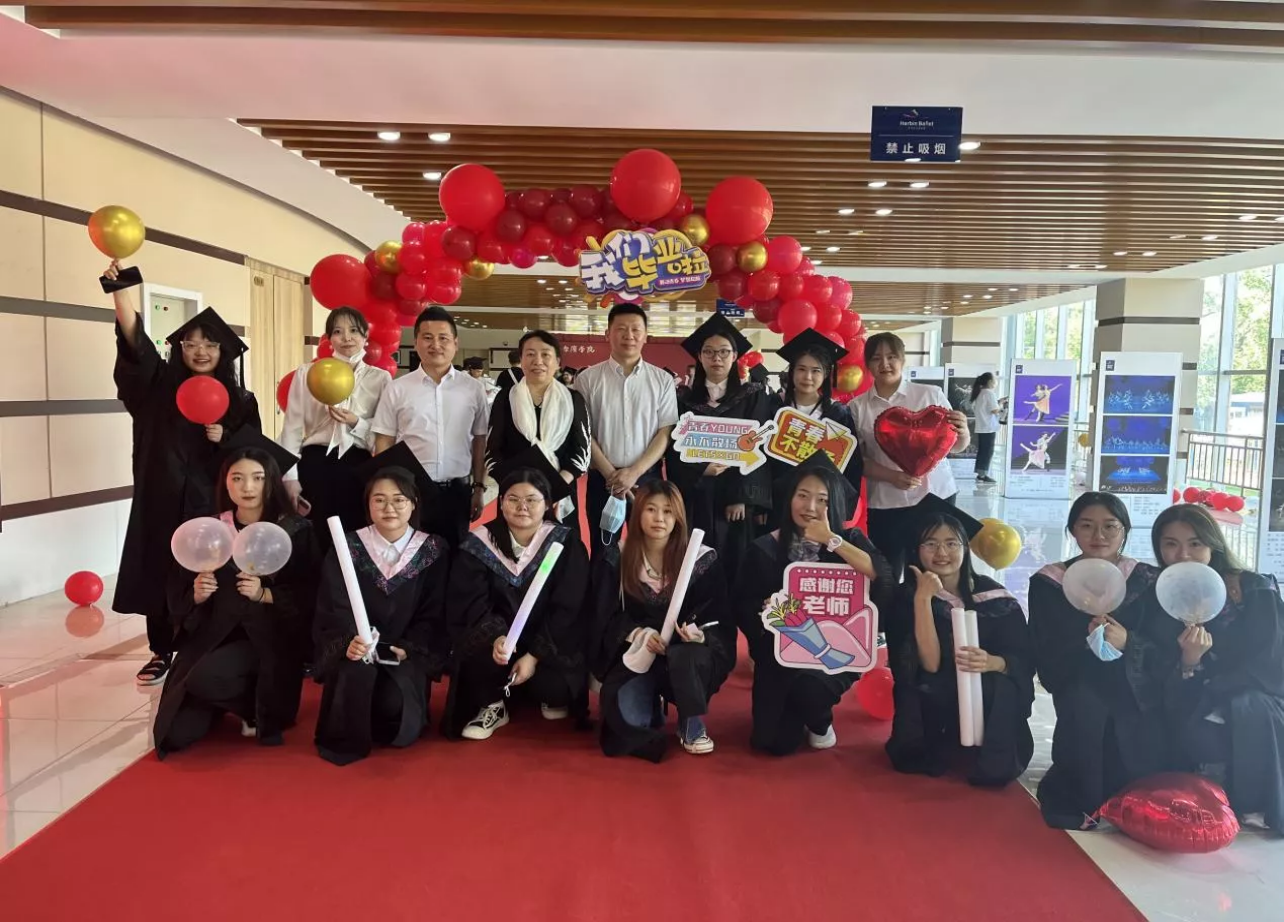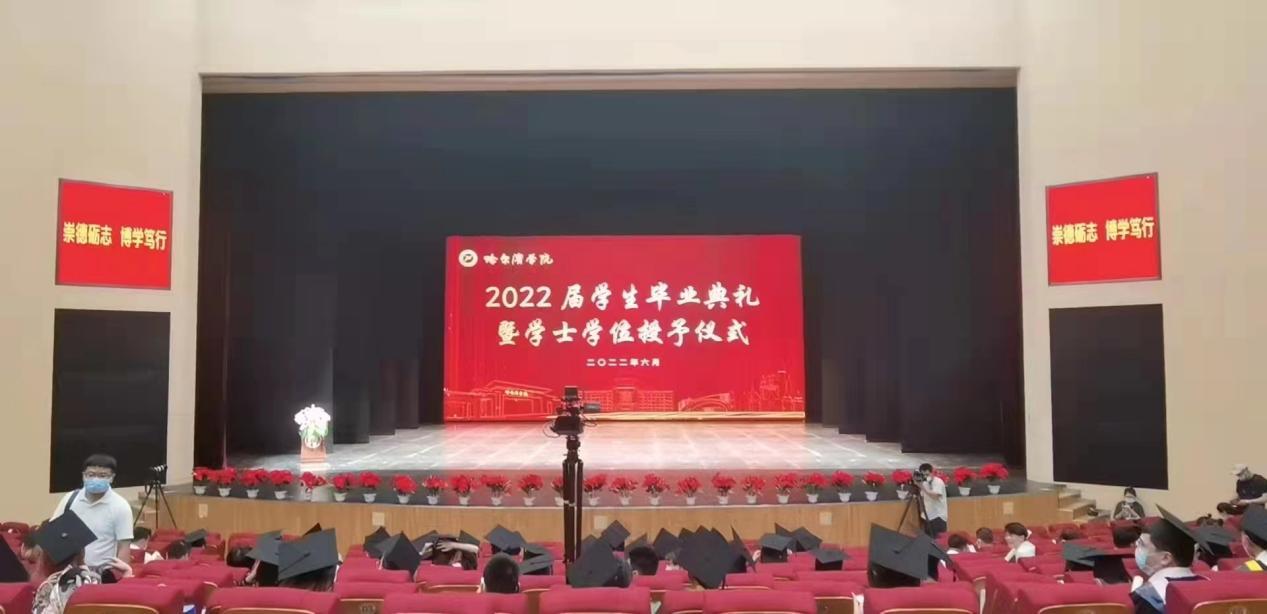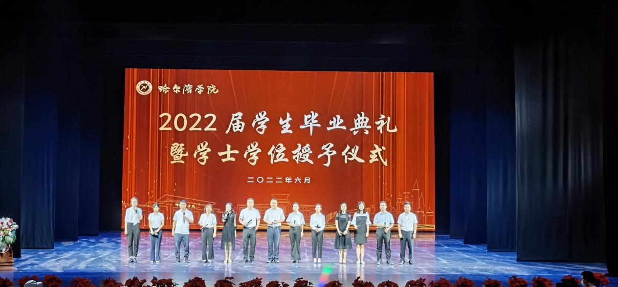 依依别母校,深深哈院情。为热情欢送我院185名毕业生走出校园,踏上人生新征程。6月18日上午9:30,哈尔滨学院2022届学生毕业典礼暨学士学位授予仪式在我校丁香剧场隆重举行。外国语学院院长孙延弢、书记冯丽杰、副处级辅导员张志涛、辅导员盖铁生、辅导员安思泰以及我院2022届12名毕业生代表出席线下典礼。本次典礼在严格遵守疫情防控要求的前提下,采取线上直播与线下互动相结合的方式开展。