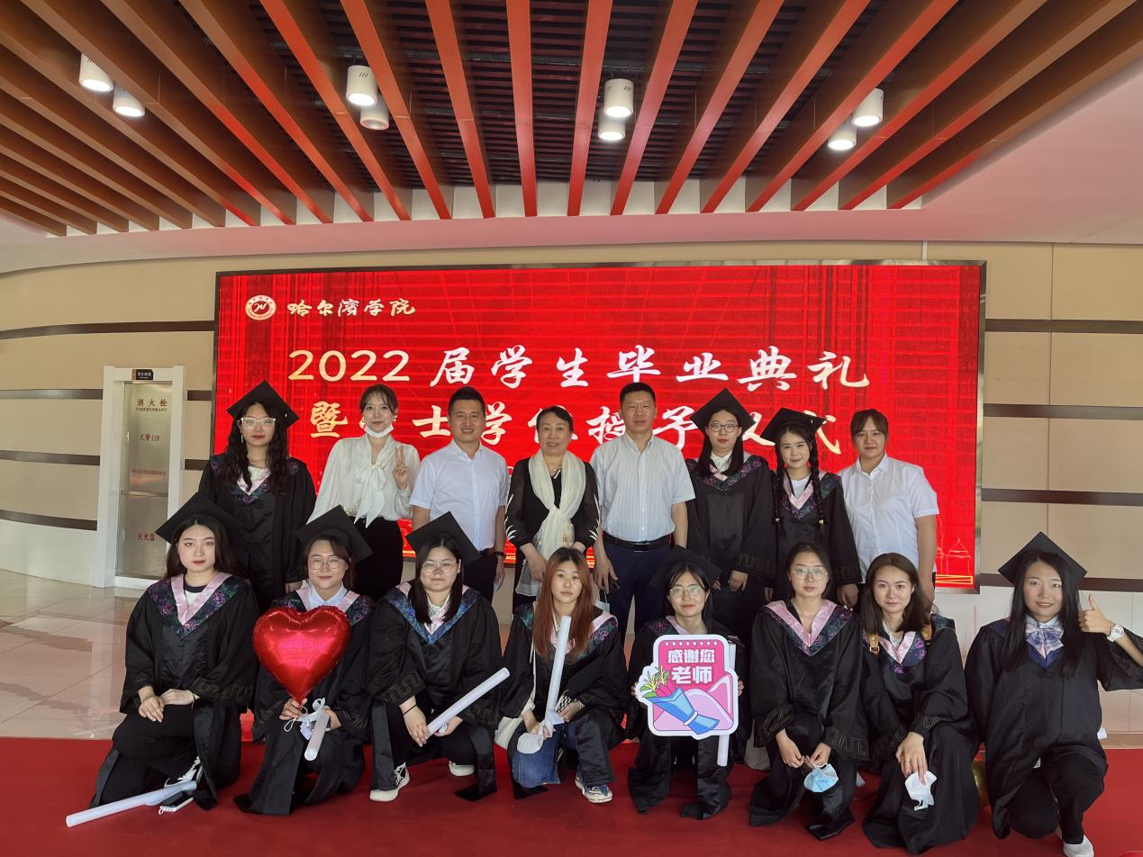 在雄壮的国歌声中,国旗仪仗队整齐的出旗仪式拉开了毕业典礼的帷幕。典礼上,党委委员、纪委书记马弘莉,党委委员、工会主席陈威,党委委员、副校长于少鹏分别宣读了《哈尔滨学院2022届优秀毕业生名单》、《哈尔滨学院关于2022届学生毕业与学士学位授予的决定》及《优秀校友理事名单》。我院杜卓璘、郝佳乐、刘思琦、汪迪、王成程、王珂璇、王楠、王硕、于淼、郭瀚隆、赵妍等11位同学获得“优秀毕业生”荣誉称号。校长、党委副书记于成学为优秀毕业生代表颁发奖杯和纪念品,并与优秀毕业生合影留念。