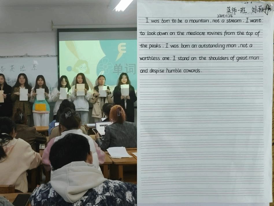 同学们准备充分,认真完成书写任务,充分利用晚自习的时间对英语单词熟悉度进行检验,现场气氛紧张而有序。单词是学习英语的基石,可以帮助同学们熟练、快速地完成阅读题,精准进行翻译和写作。规范整洁的英语书写,不仅会带动学生词汇与阅读能力的提升,同时也将提升学生的英语综合素养。同学们不仅体会到了英语学习的魅力,提高了单词储备量,也养成了良好的学习习惯,为今后的个人发展打下了坚实的基础。