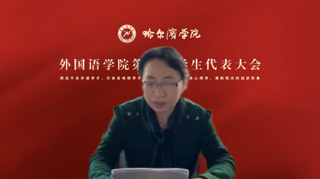 学生会主席庞浩同学致开幕词,代表学生会向大会的胜利召开表示祝贺,向出席大会的学院党政领导、群团学工教务等方面指导老师、校内外有关方面代表、兄弟学院学生会代表表示感谢,向出席大会的全体代表并通过他们向全院711名在校生致以问候和祝愿。他对全体与会正式代表提出要求,呼吁广大外语学子继续发扬我校“崇德砺志,博学笃行”校训精神,高擎“请党放心,强国有我”的理想气质,以锐意创新的勇气、敢为人先的锐气、蓬勃向上的朝气,做有理想信念、有道德情操、有家国情怀,有责任担当,有过硬本领的“五有”哈院外语人。 经济管理学院学生会主席齐欣悦同学代表经济管理学院、食品工程学院、信息工程学院、土木建筑工程学院、地理与旅游学院、音乐与舞蹈学院、文法学院、教师教育学院等十余个兄弟学院学生会致贺词,她表示愿同外国语学院学生会一起努力向前,勇当求真务实的奋进者、敢闯敢试的开拓者、攻坚克难的搏击者、坚忍不拔的创新者、服务同学的领跑者。