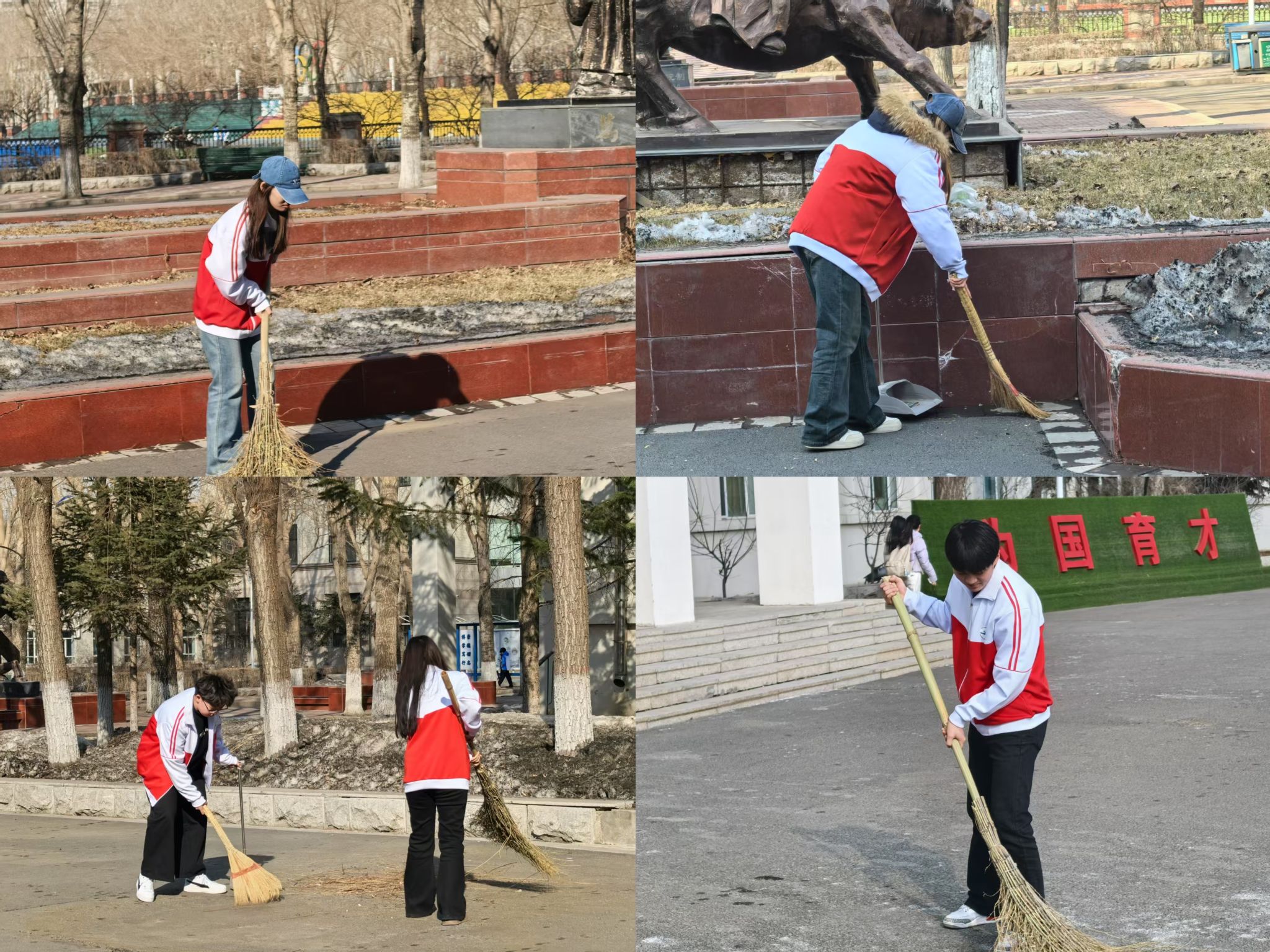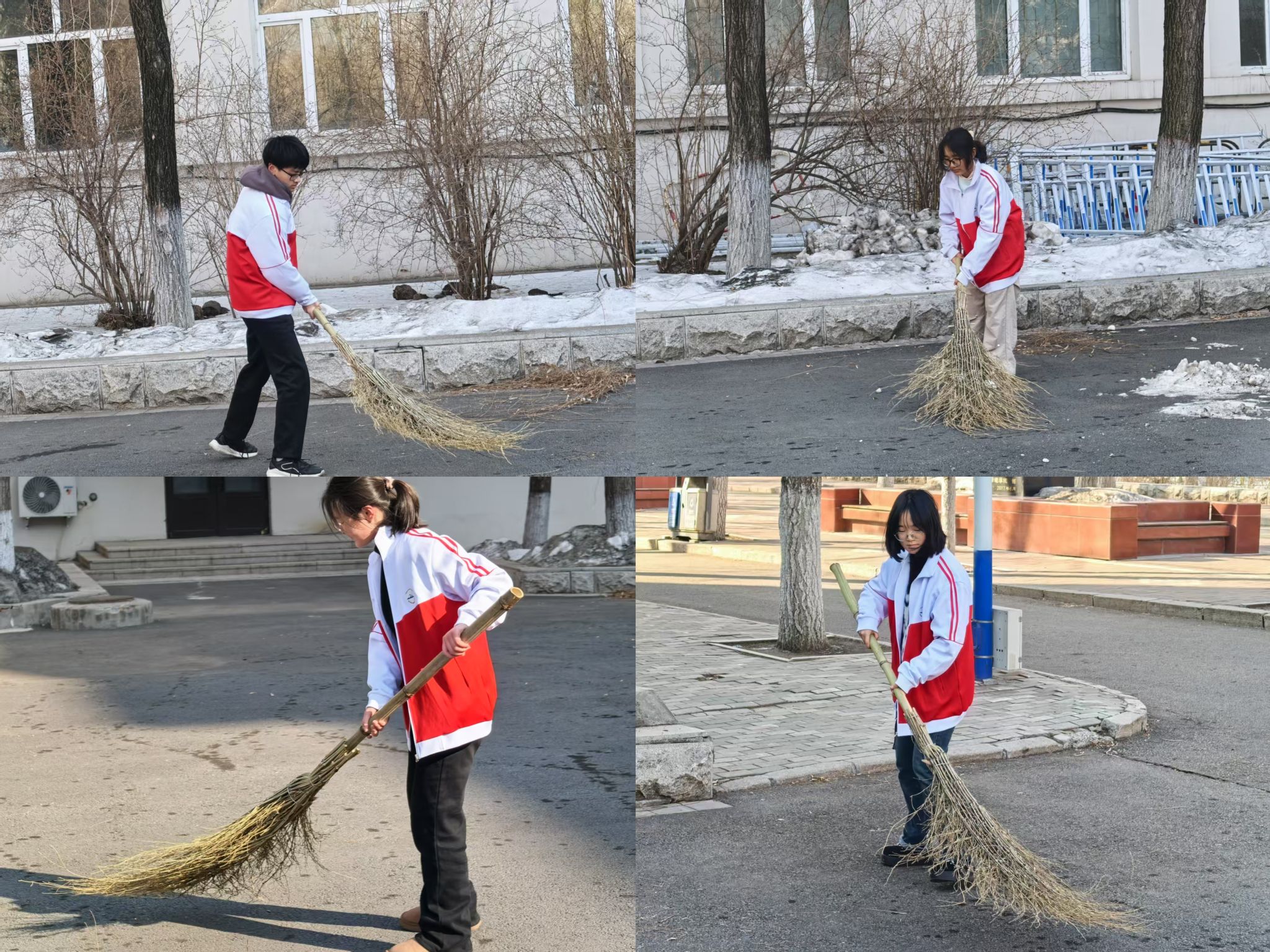 此次活动重点聚焦于教学楼前后区域,这里作为师生日常出入的必经之路,人流量密集,卫生状况一直备受关注。活动一经发起,便得到了学生们的热烈响应与踊跃参与。活动当日,尽管室外寒风瑟瑟,但同学们的热情丝毫未减。大家按时在指定地点整齐集合,怀揣着对校园的热爱和为美化校园贡献力量的决心,有序领取清洁工具后,迅速而有序地投身于清扫工作之中。