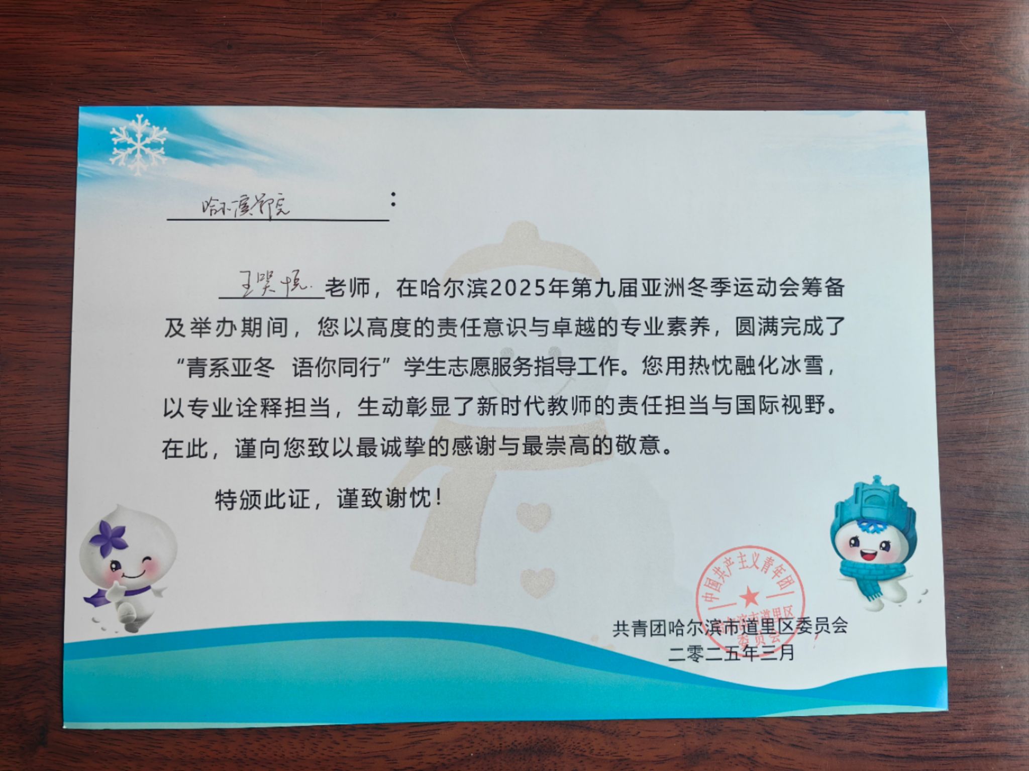 2025年3月,道里团区委向外国语学院团干部王笑悦及学生志愿者发来感谢信,信中特别肯定了外语学子"以专业素养破语言壁垒,以青年热忱暖冰雪之城"的突出贡献。这份认可不仅是对志愿者们辛勤付出的高度认可,更是对学院志愿服务工作的充分肯定。