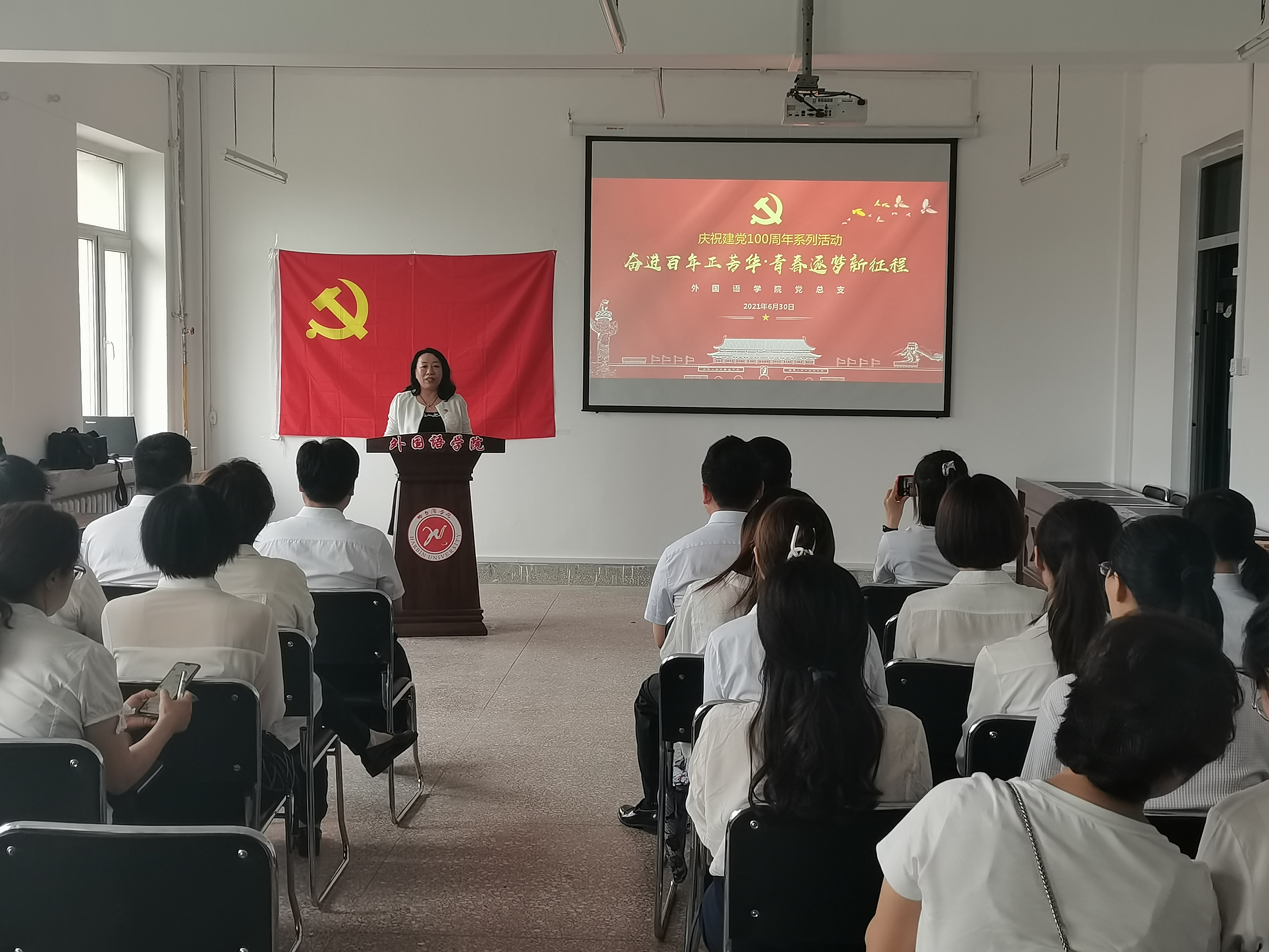 百年沧桑,薪火相传。为庆祝中国共产党成立100周年,巩固党史学习教育成效,2021年6月30日下午,外国语学院在1527会议室举行“奋进百年正芳华,青春逐梦新征程”为主题的庆祝中国共产党成立100周年系列活动。我院全体班子成员和全体党员教师参加大会,会议由党总支书记冯丽杰主持。