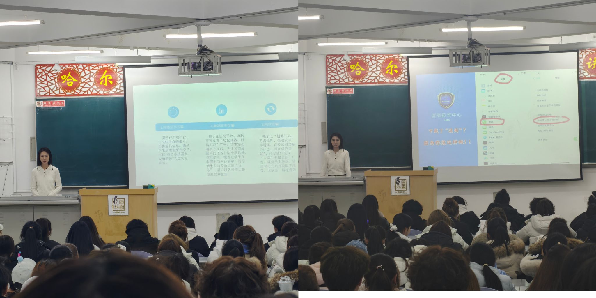 随后,王笑悦结合“刷单返利”、“游戏代练”、“虚假贷款”等高校内高发案例,深入剖析了诈骗分子的作案手法和心理操控策略。她指出,诈骗话术往往利用人性弱点,先以“小额返利”骗取信任,再制造“危机情境”引发恐慌,进而通过“任务升级”持续施压,最终达到骗取大额资金的目的。她还设置了互动答疑环节,鼓励同学们积极提问、主动思考。现场气氛热烈,多名同学踊跃发言,有的分享身边案例,有的就如何识别可疑链接、核实对方身份等具体问题进行提问,有效引导大家从“被动接受”转向“主动辨识”与“深度思考”,真正将“不听、不信、不转账”的反诈要诀内化于心。最后,王笑悦现场指导全体同学下载并实名注册“国家反诈中心”APP,开启预警功能,为同学们的财产安全增添一道技术屏障。