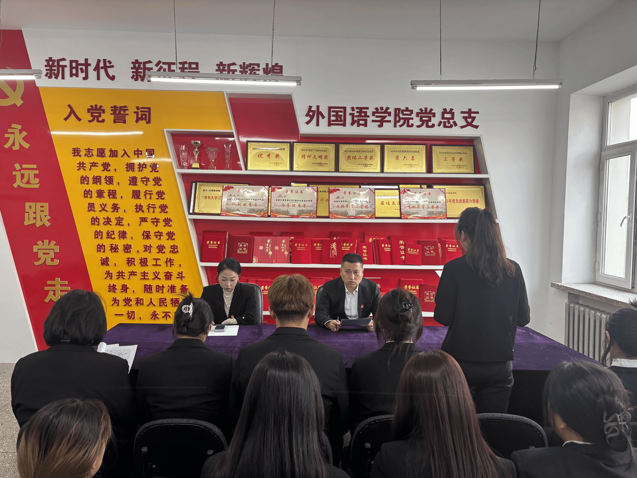 为深入学习贯彻习近平新时代中国特色社会主义思想和党的二十大精神,严格规范党员发展程序,筑牢党员队伍建设根基,强化党员的责任担当与使命意识,充分发挥党员先锋模范作用,持续提升基层党组织的凝聚力、战斗力和组织力,外国语学院学生第二党支部于 2025 年 11 月 11 日在党员之家隆重召开预备党员转正大会。会议由党支部书记盖铁生主持,支部全体党员参会。