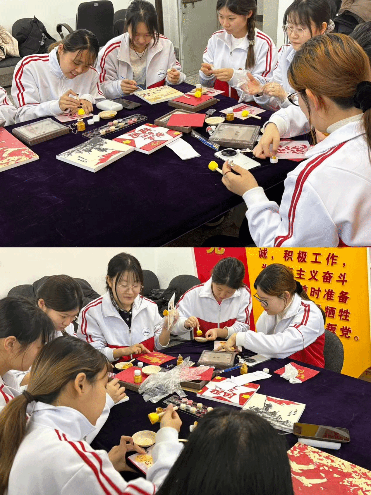 在绘画实践环节,同学们以“红色印记”为主题,分组进行油画与拓印画的创作。大家神情专注,笔触认真,用色彩与线条勾勒出对革命历史的敬仰与对初心使命的理解。一幅幅作品不仅展现了外院学子的艺术素养,更传递出浓厚的爱国情怀与红色基因。活动中,同学们互相交流创作灵感,分享对红色精神的理解,现场气氛庄重而热烈。