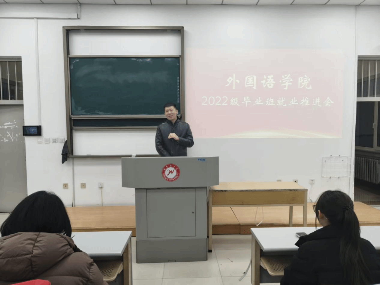 (文/盖铁生)为深入贯彻落实校党委关于我校毕业生就业工作的决策部署,扎实推进“党建引领就业育人”工作落地见效,切实提升毕业生就业竞争力与求职精准度,11月28日晚,外国语学院召开2026届毕业生就业推进会。会议由学院副教授辅导员盖铁生主持,党总支书记张志涛参会,全体2026届毕业生参会。