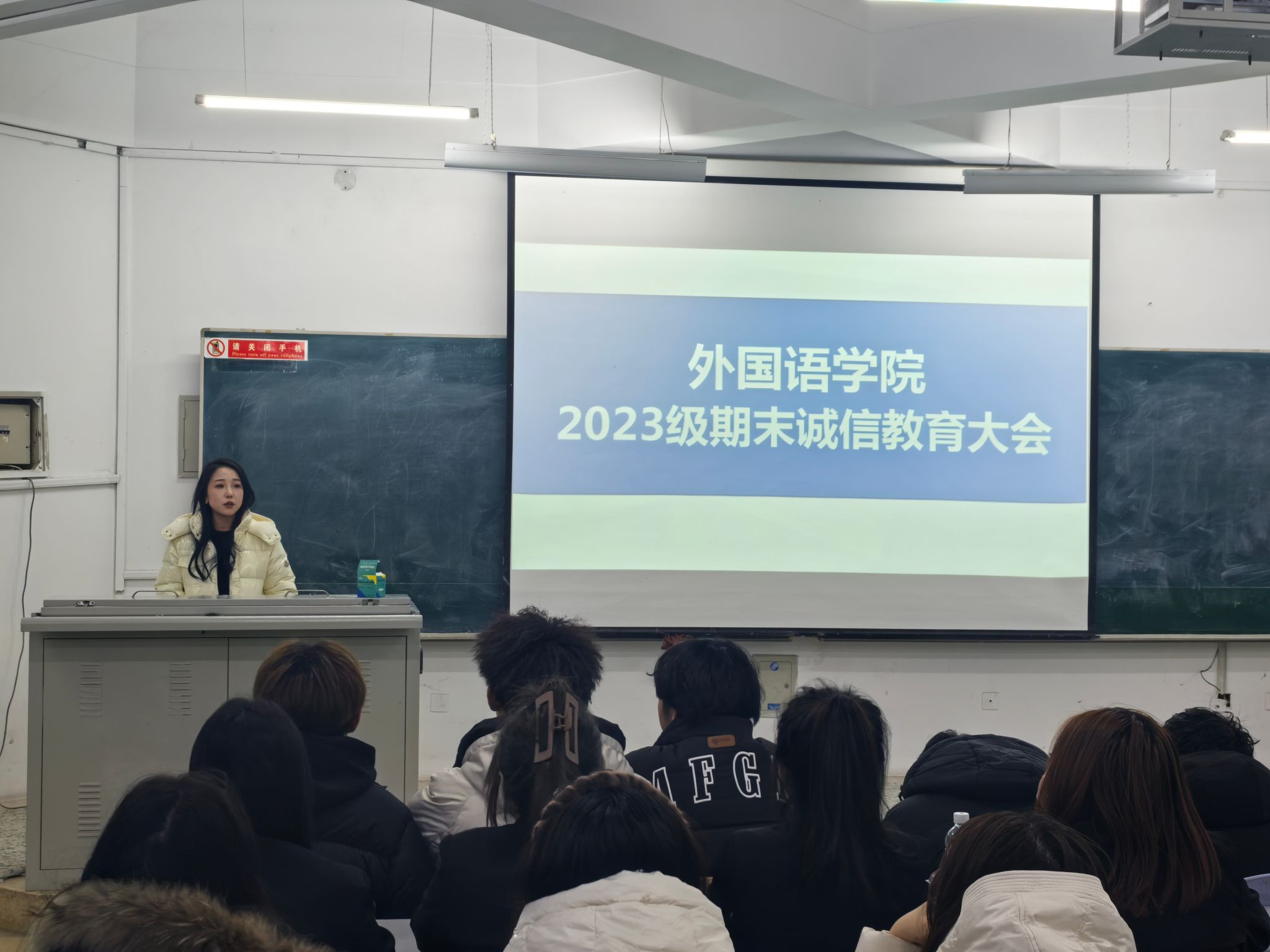 (文/林薪宜)为进一步加强我院学风建设,增强学生诚信意识,营造风清气正、公平公正的考试环境,12月3日,外国语学院在5238教室组织召开了2023级学生期末诚信教育大会。本次大会由2023级辅导员林薪宜主持,2023级全体学生参加。