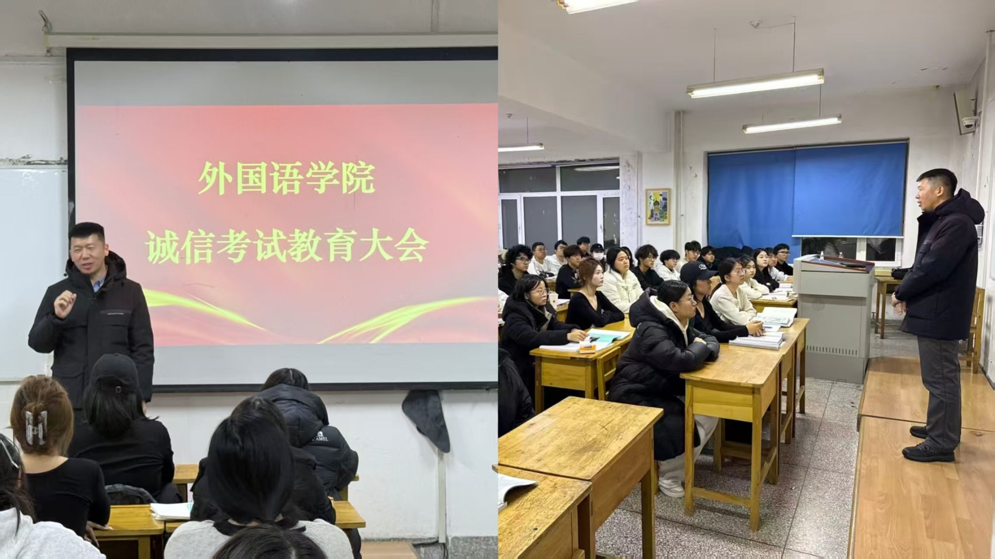 (文/王笑悦)为深入落实《中共哈尔滨学院委员会“知敬畏懂规矩守纪律 强教风正学风树新风”专项行动工作方案》精神,加强考风建设,严肃考试纪律,营造公平公正的育人环境,2025年12月8日晚,外国语学院在2号楼组织召开了2025级学生诚信教育大会。学院党总支书记张志涛、学工办公室主任笑悦出席,全体2025级学生参加会议。