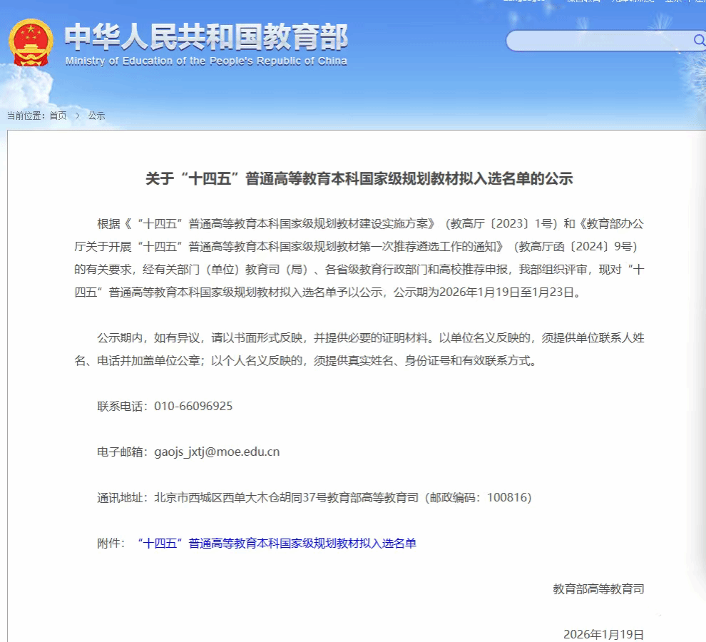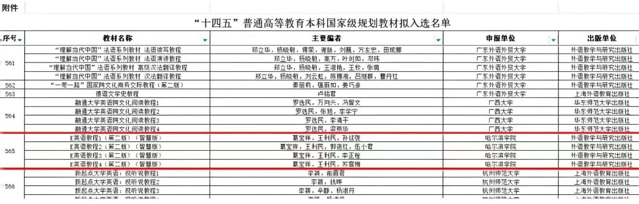 近日,教育部发布“十四五”普通高等教育本科国家级规划教材公示名单,由我校外国语学院独立承编、外语教育与教学出版社出版的《E英语教程1》(第二版)(智慧版)《E英语教程2》(第二版)(智慧版)《E英语教程3》(第二版)(智慧版)《E英语教程4》(第二版)(智慧版)(以下简称“《E英语教程》系列”)等系列教材全部成功入选,斩获高等教育教材领域的国家级荣誉,实现了我校“国字号”教材建设的重大进展,为学校教育教学改革与学科建设再添重磅成果!这是学校在“十五五”开局之年取得的又一项国家级标志性成果。该荣誉是对我校教材编写质量与教学改革成效的高级别认可,标志着我校在高等教育核心资源建设方面迈上了新台阶。