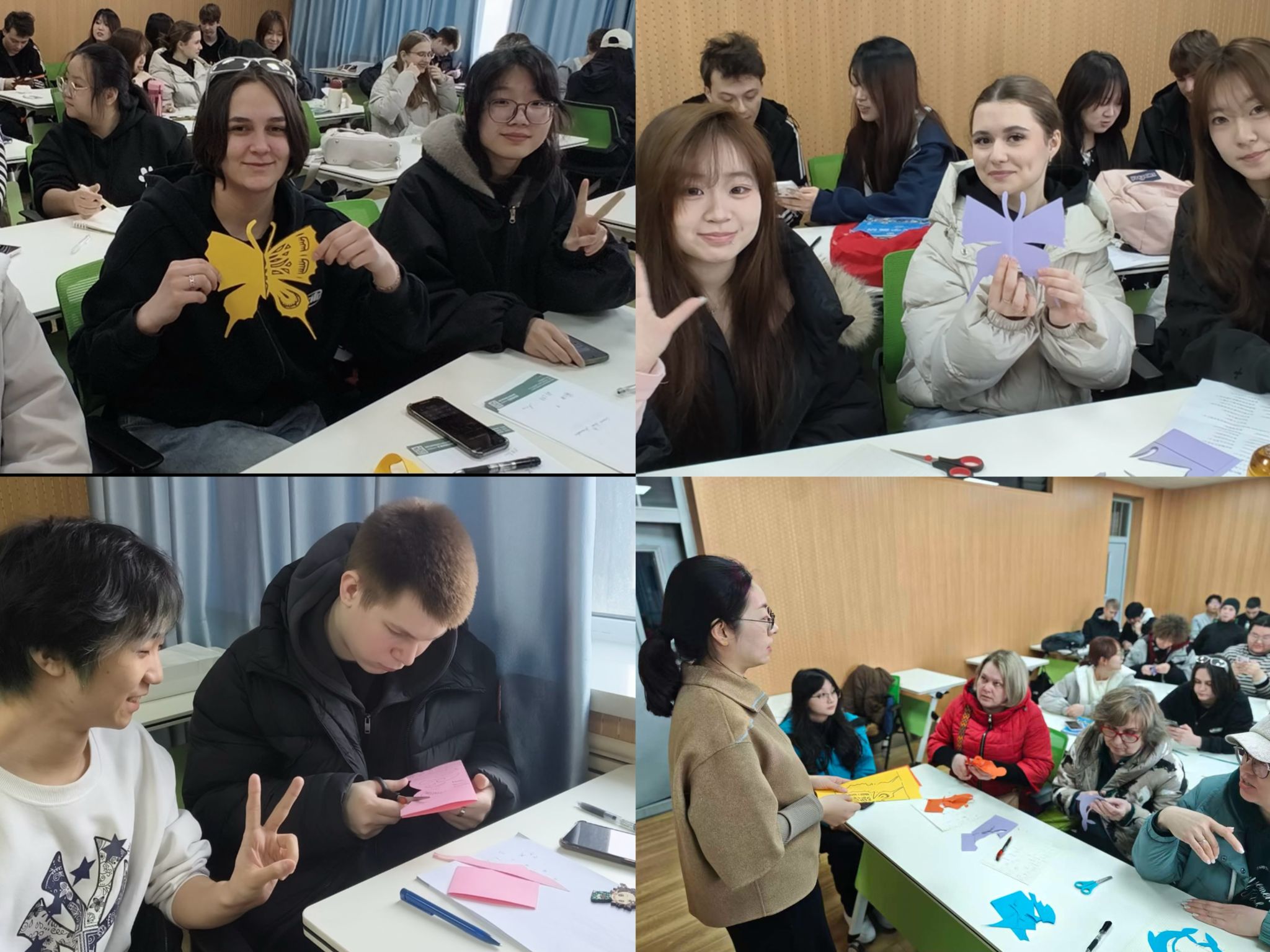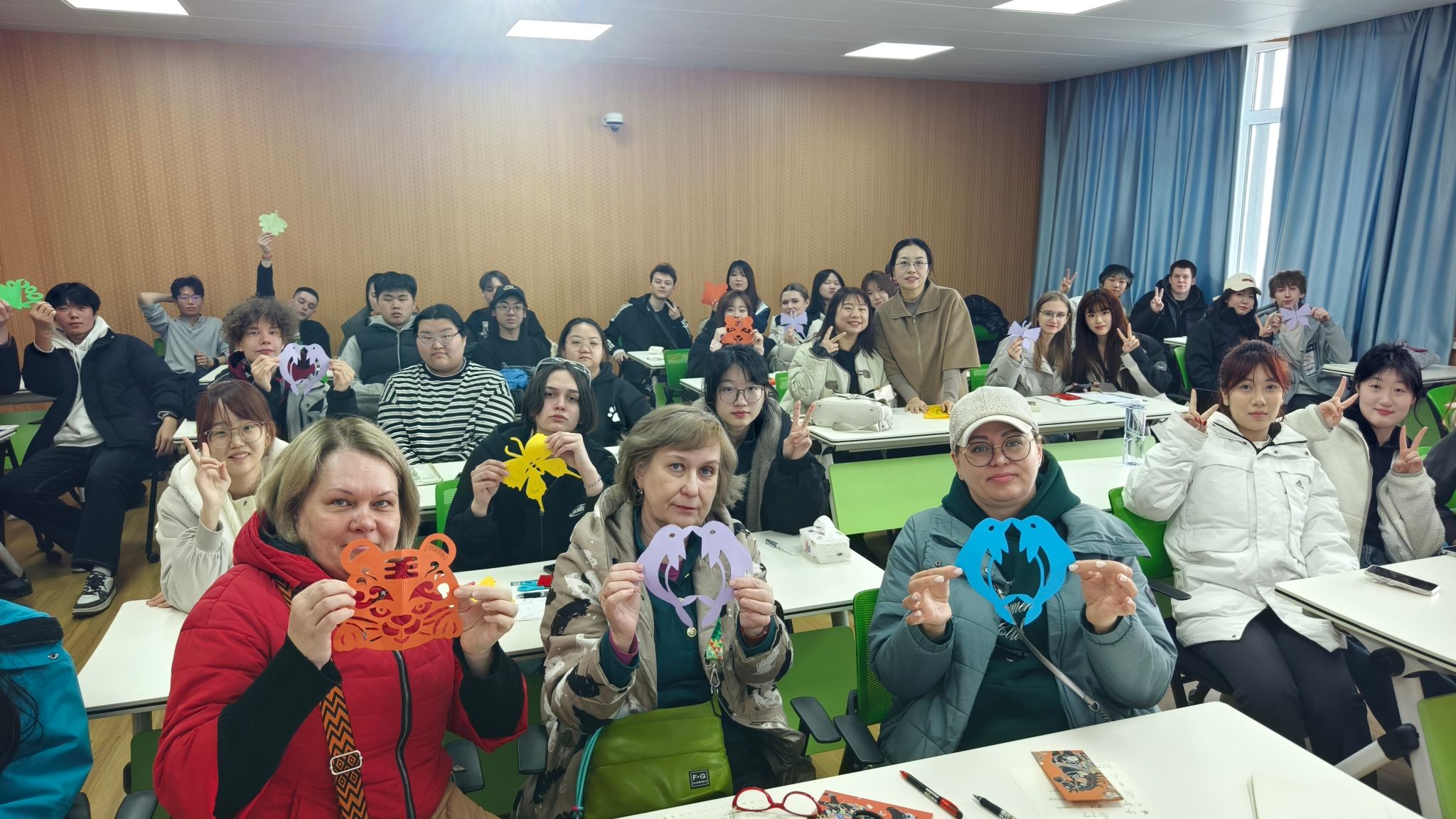 此次研学活动内容丰富。俄罗斯代表团首先参观我校校园,并通过图文展示了解哈尔滨的冰雪文化魅力。随后,代表团走进俄语系李玫老师的课堂,中俄学生共同体验汉字书写与剪纸艺术。我院俄语专业学生为活动提供全程语言支持, 展现了扎实的专业能力和跨文化沟通水平。
