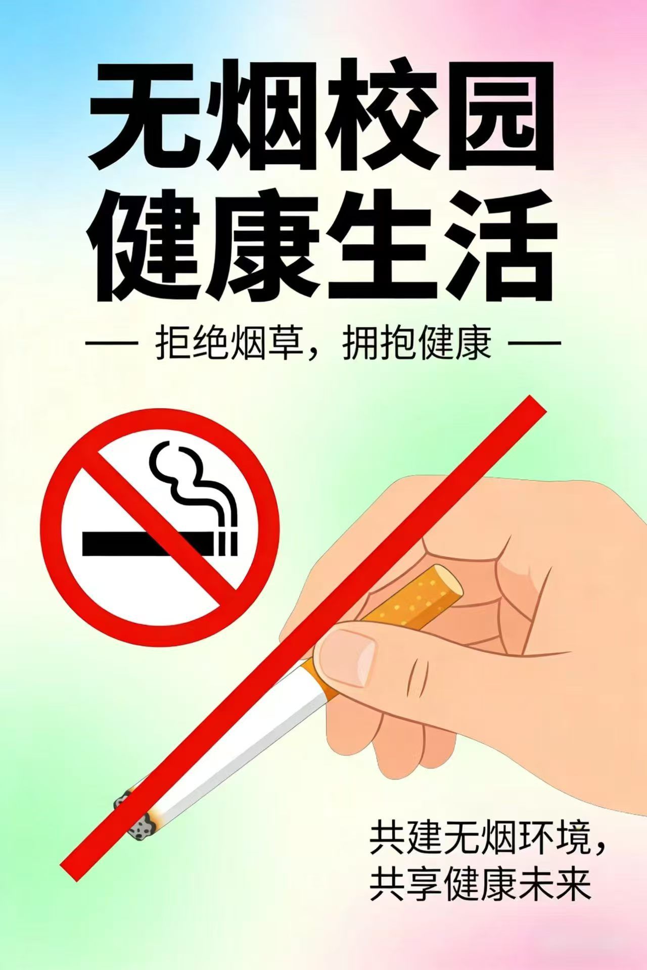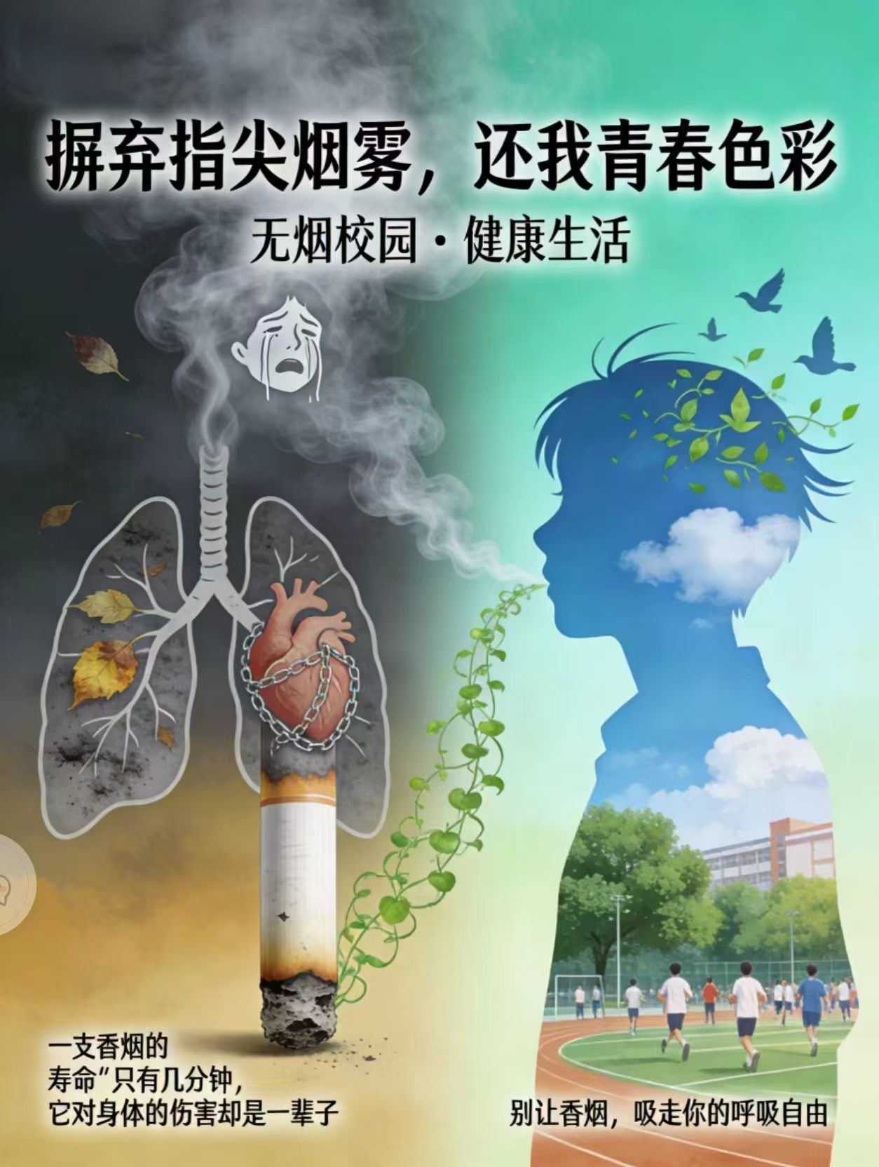 25级英语(师范)1班贺玉坤:以清新绿色为主调,结合禁烟标识与校园元素,突出吸烟及电子烟对健康与环境的危害,倡导共建无烟校园。