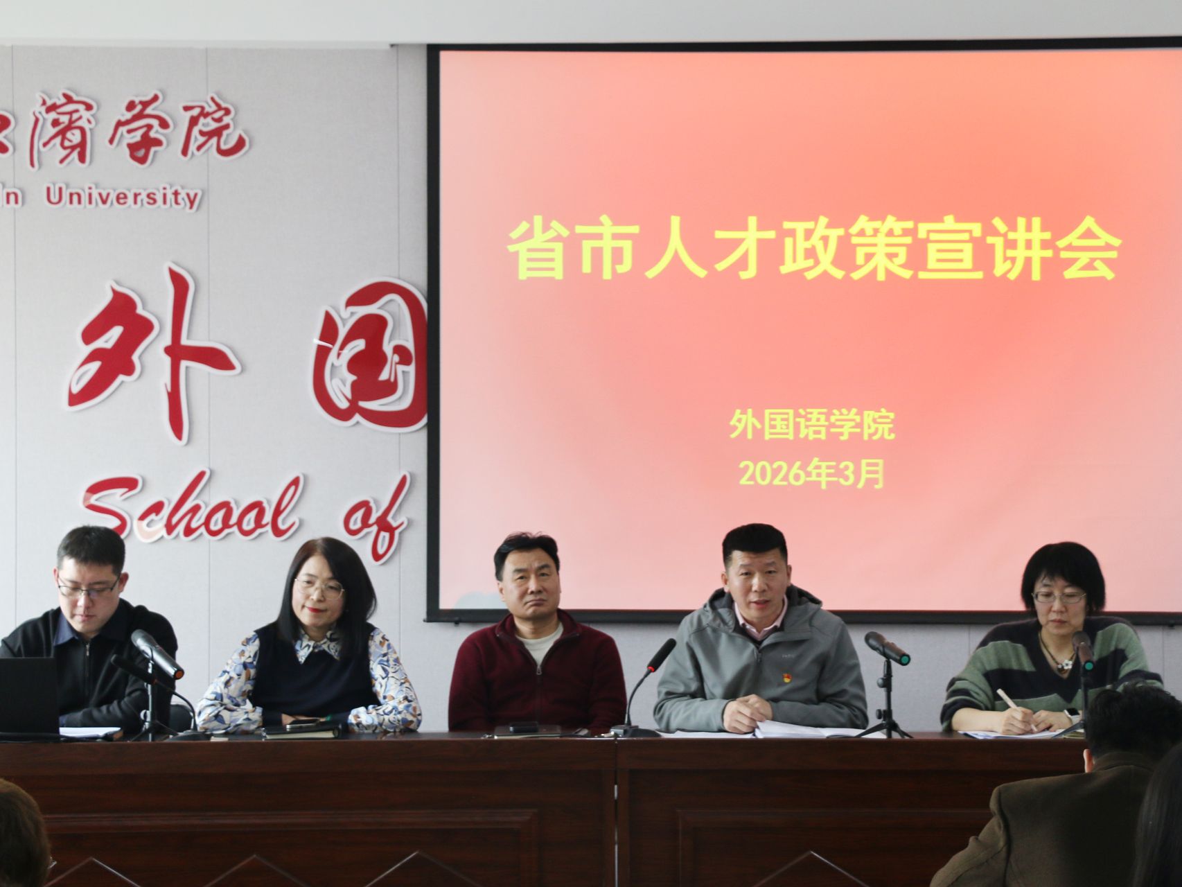 为深入贯彻落实省市人才工作部署,准确把握新时代人才政策导向,进一步提升学院人才工作水平,3月31日,外国语学院组织全院学习省市人才政策精神宣讲会,院班子全员参加学习并结合学院实际对相关工作进行部署,学院全体教职工参加学习。