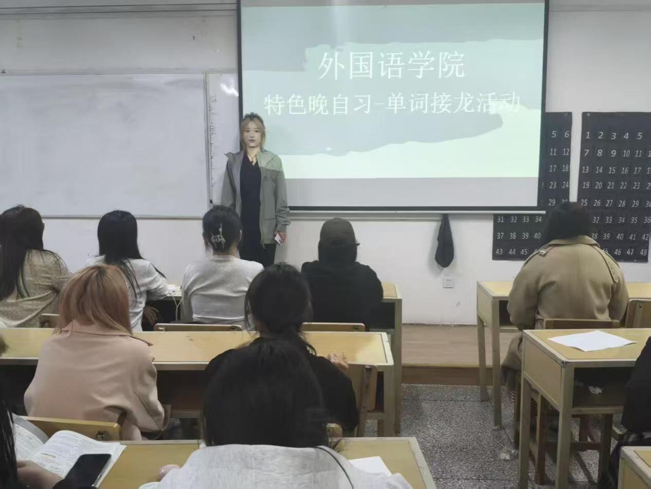 为持续深入推进学风建设,丰富学生晚自习形式,激发学生语言学习兴趣,营造“比学赶超”的浓厚氛围,4月1日晚,外国语学院在2503教室举办“单词接龙大赛”特色晚自习活动。2025级英语(师范)专业学生参加。