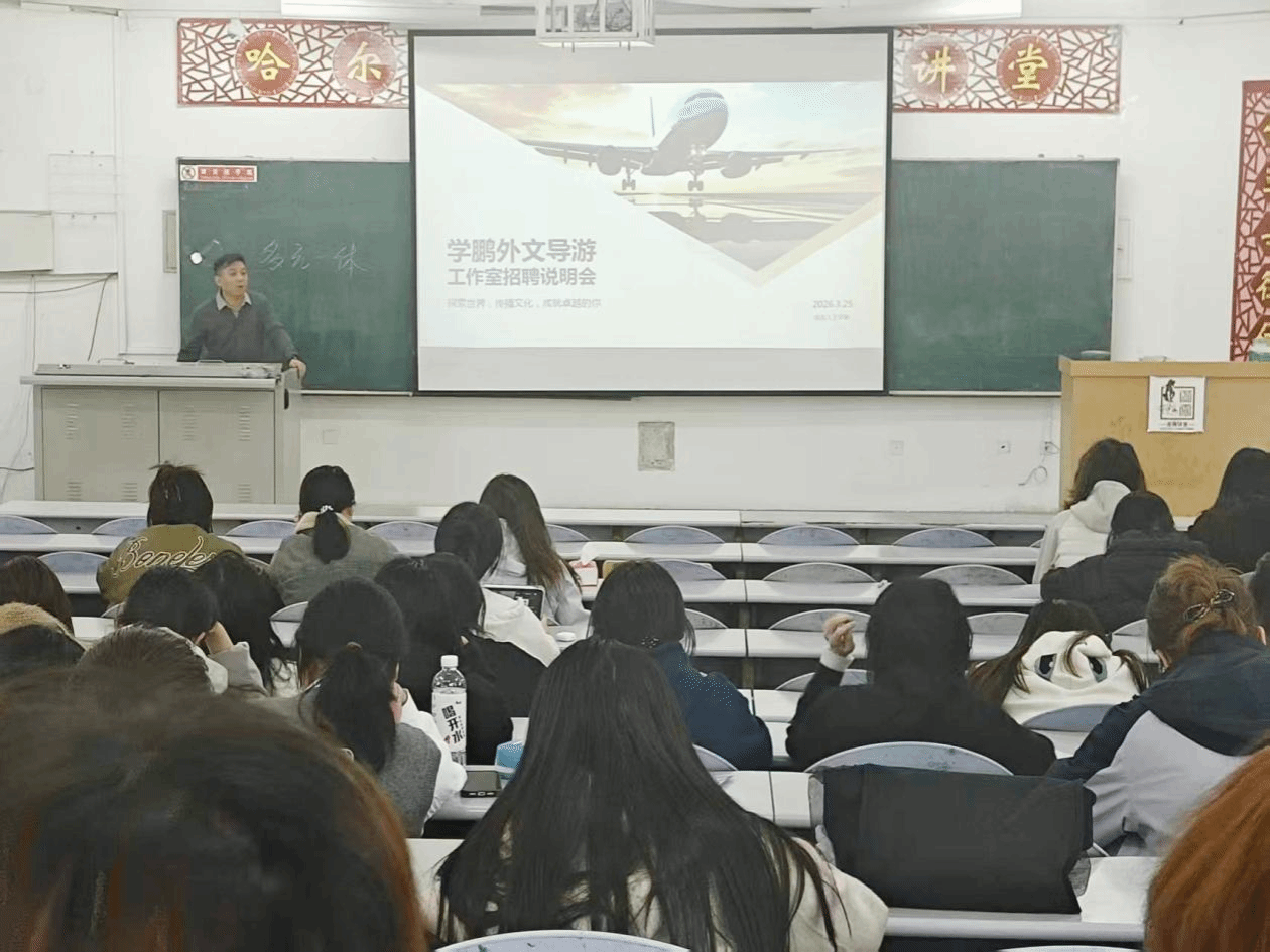 宣讲会在热烈的掌声中拉开帷幕。首先,王学鹏简要介绍了学鹏外文导游工作室的基本情况、发展历程以及在外文导游和涉外文旅服务领域取得的成果。他结合自身多年行业管理经验,展示了外文导游、涉外领队、跨境文旅策划等岗位的广阔发展前景,并指出,当前国际交往日益频繁,具备扎实外语功底、熟悉跨文化沟通技巧的复合型人才,正成为文旅市场上的“稀缺资源”,而外语专业学生在这一领域拥有天然优势。