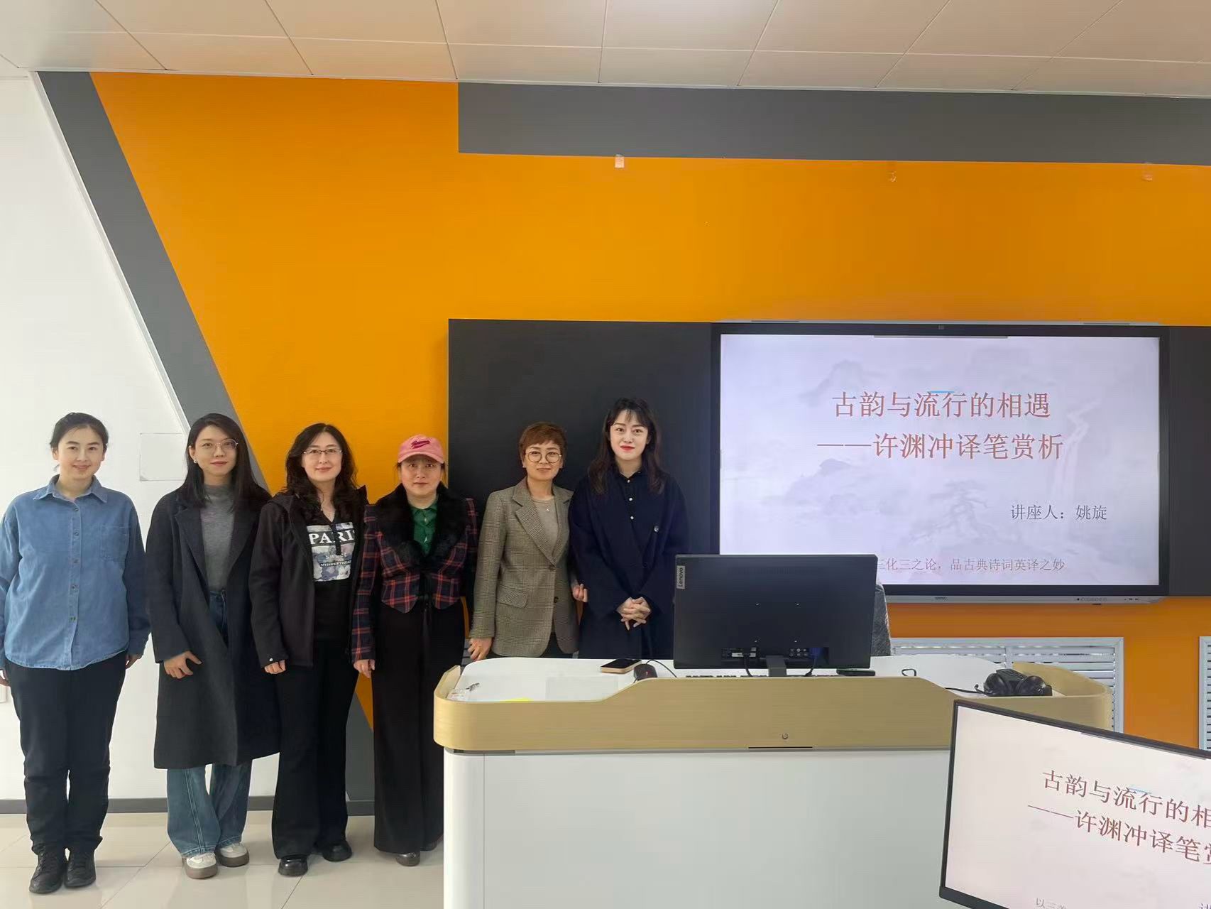 2026年4月8日下午,外国语学院全体商务英语教师及学生齐聚学术报告厅,参与“外语之声”科研讲座第45讲。本次讲座由姚旋老师主讲,以“古韵与流行的相遇——许渊冲译笔赏析”为主题,结合翻译理论与经典译例,系统分享许渊冲诗词英译的艺术特色与文化传播价值。