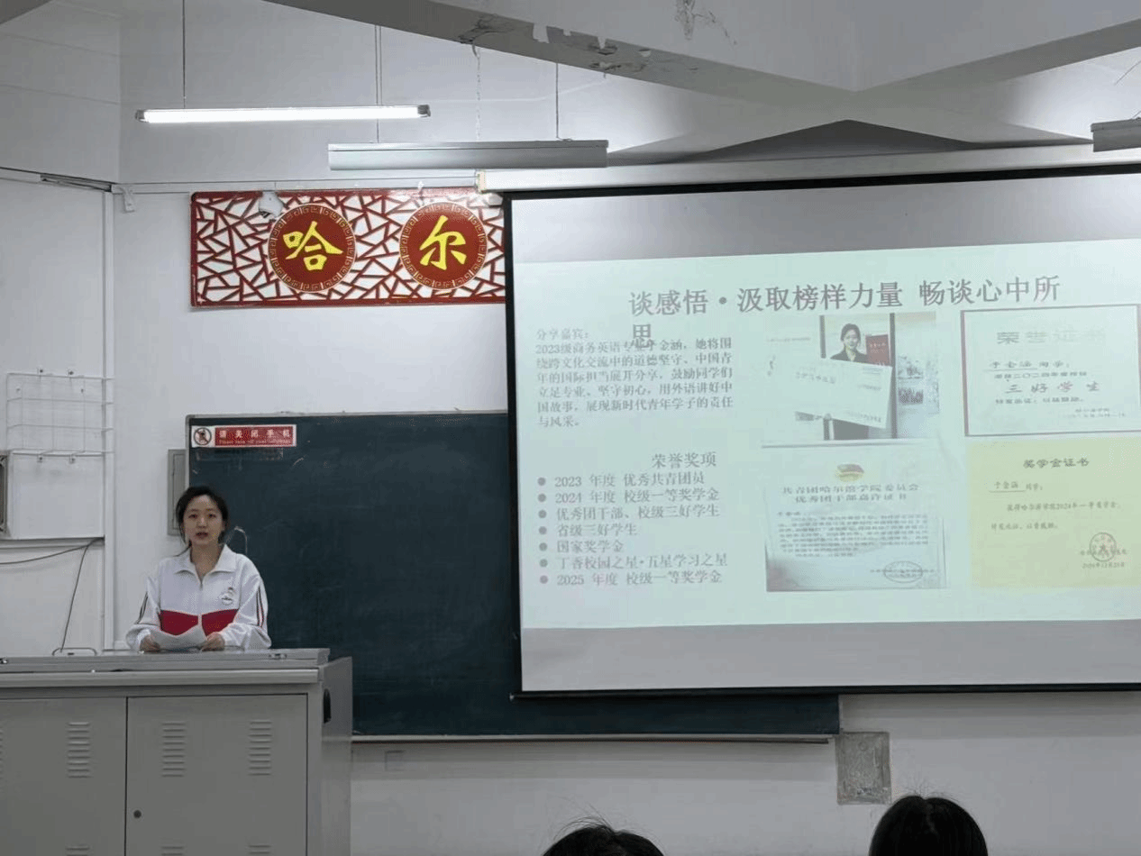 在“谈感悟”环节,学生代表国家奖学金获得者商务英语23-2班于金涵发言。她从跨文化交流中的道德坚守、中国青年的国际担当、外语学习与传统美德结合三个维度分享体会,提出外语学子应尊重文化差异、坚守道德底线,用多种语言向世界讲好中国故事,践行“和而不同”的中国智慧,引发全场共鸣。