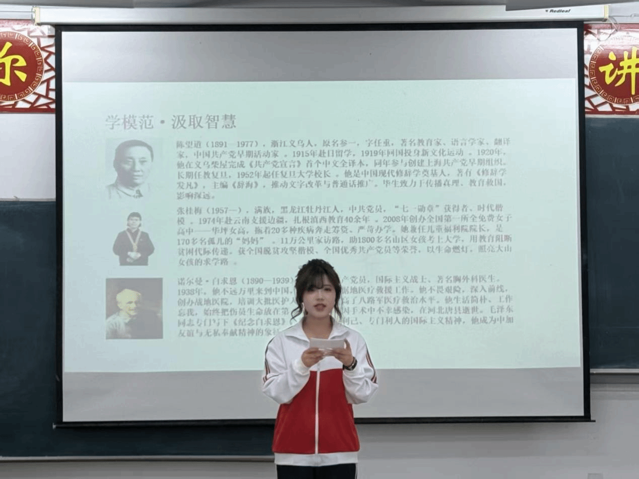 本次道德讲堂涵盖“唱歌曲、学模范、诵经典、谈感悟、宣誓”五个环节,活动在《公民道德歌》中拉开序幕。在“学模范”环节,师生共同学习了陈望道、张桂梅、白求恩三位榜样的感人事迹。学生自主编排的白求恩主题情景剧,生动再现其救死扶伤的瞬间,让师生沉浸式感悟榜样力量。