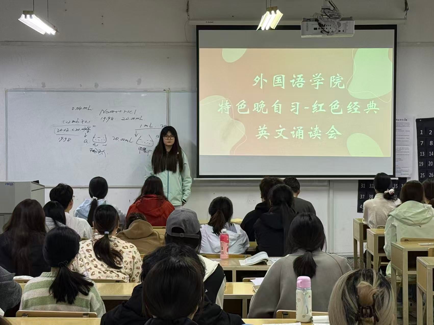 (文/王笑悦)为深化思政教育成效,丰富晚自习活动载体,推动英语专业素养与传承红色文化深度融合,4月13日,外国语学院在2501教室举办了“诵读红色经典,赓续精神血脉”红色经典英文诵读会。本次活动由学联部李昊颖主持,2025级英语(师范)专业全体学生参加。