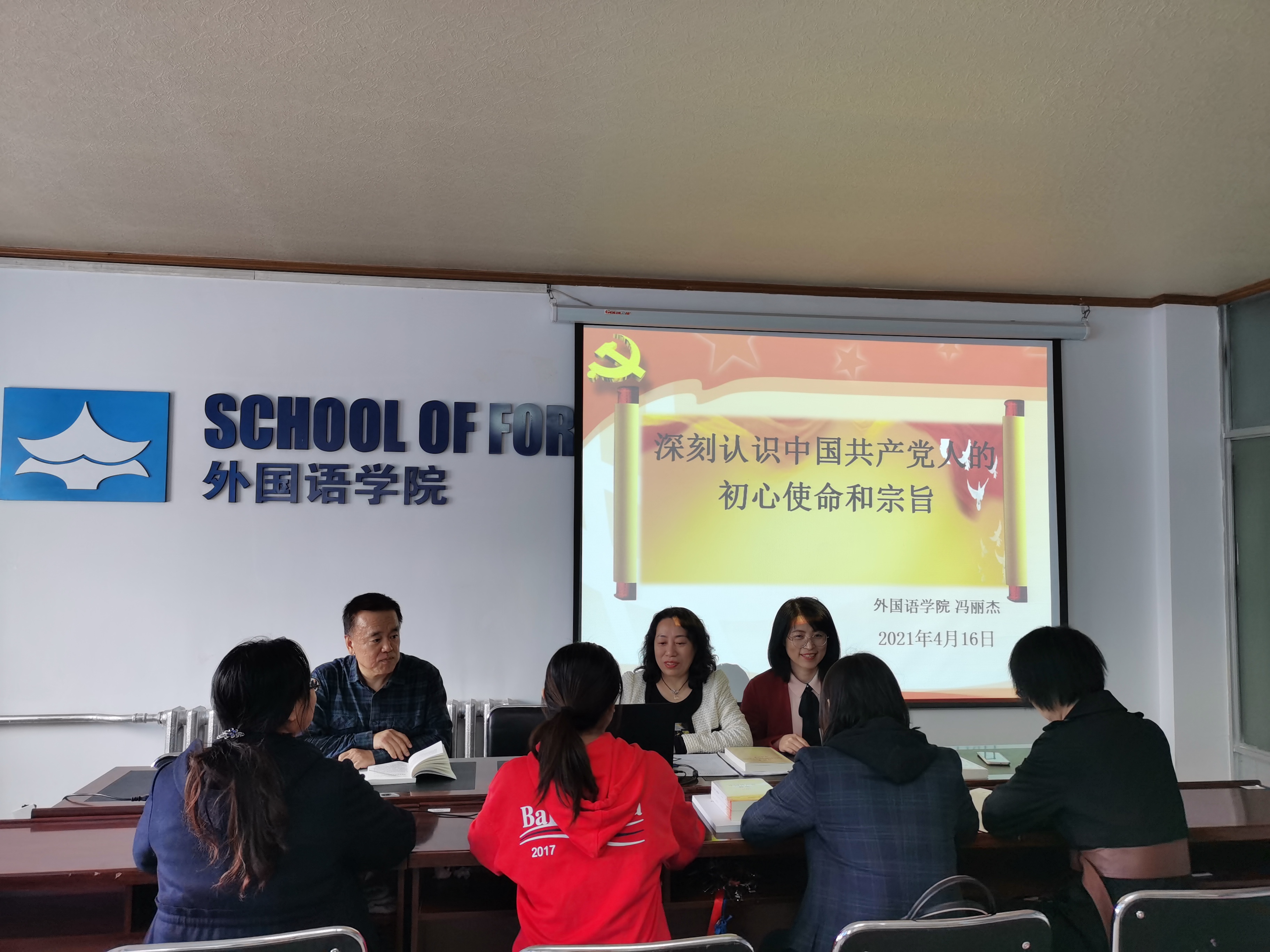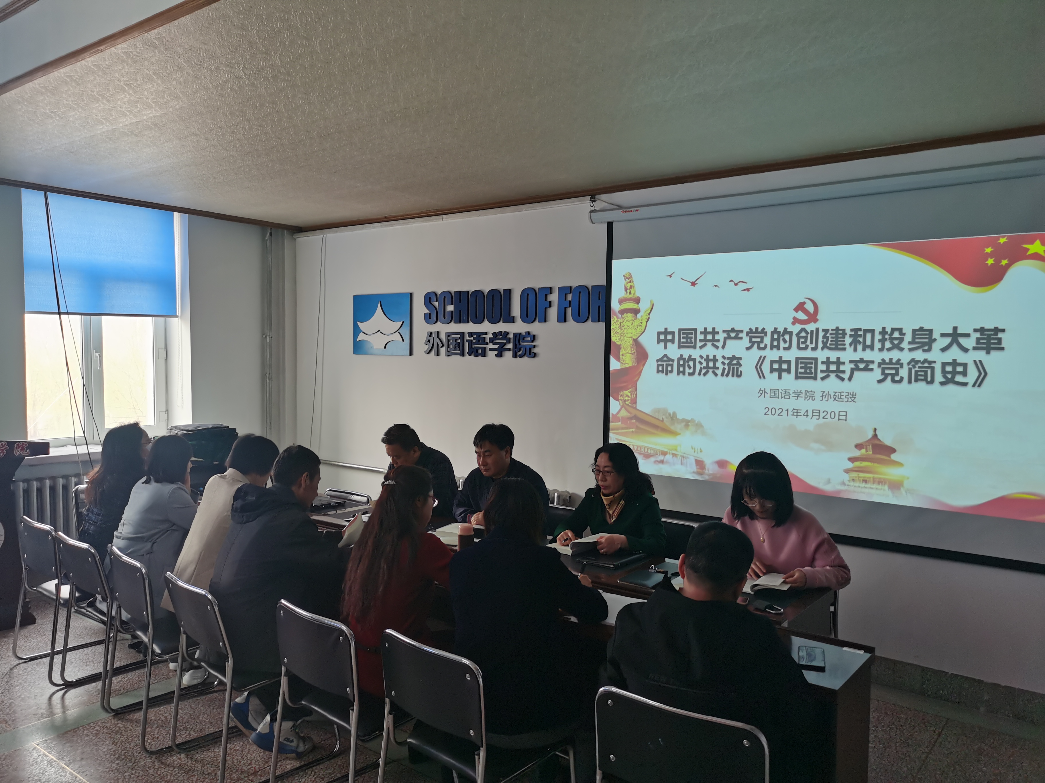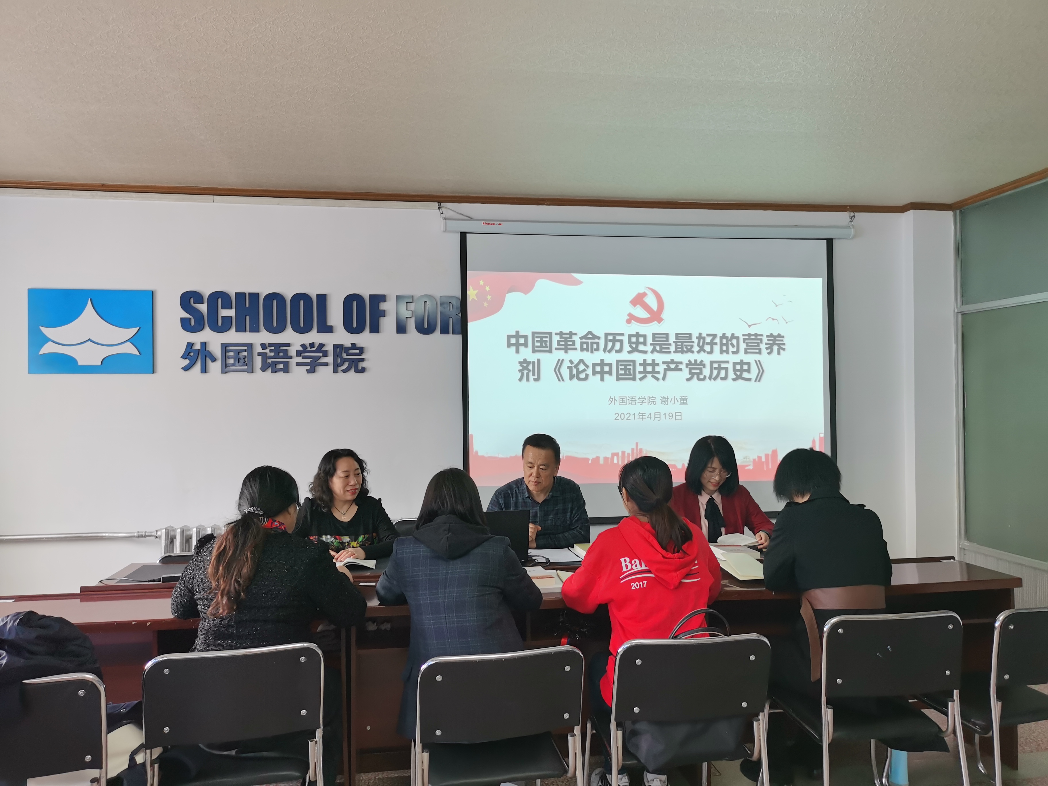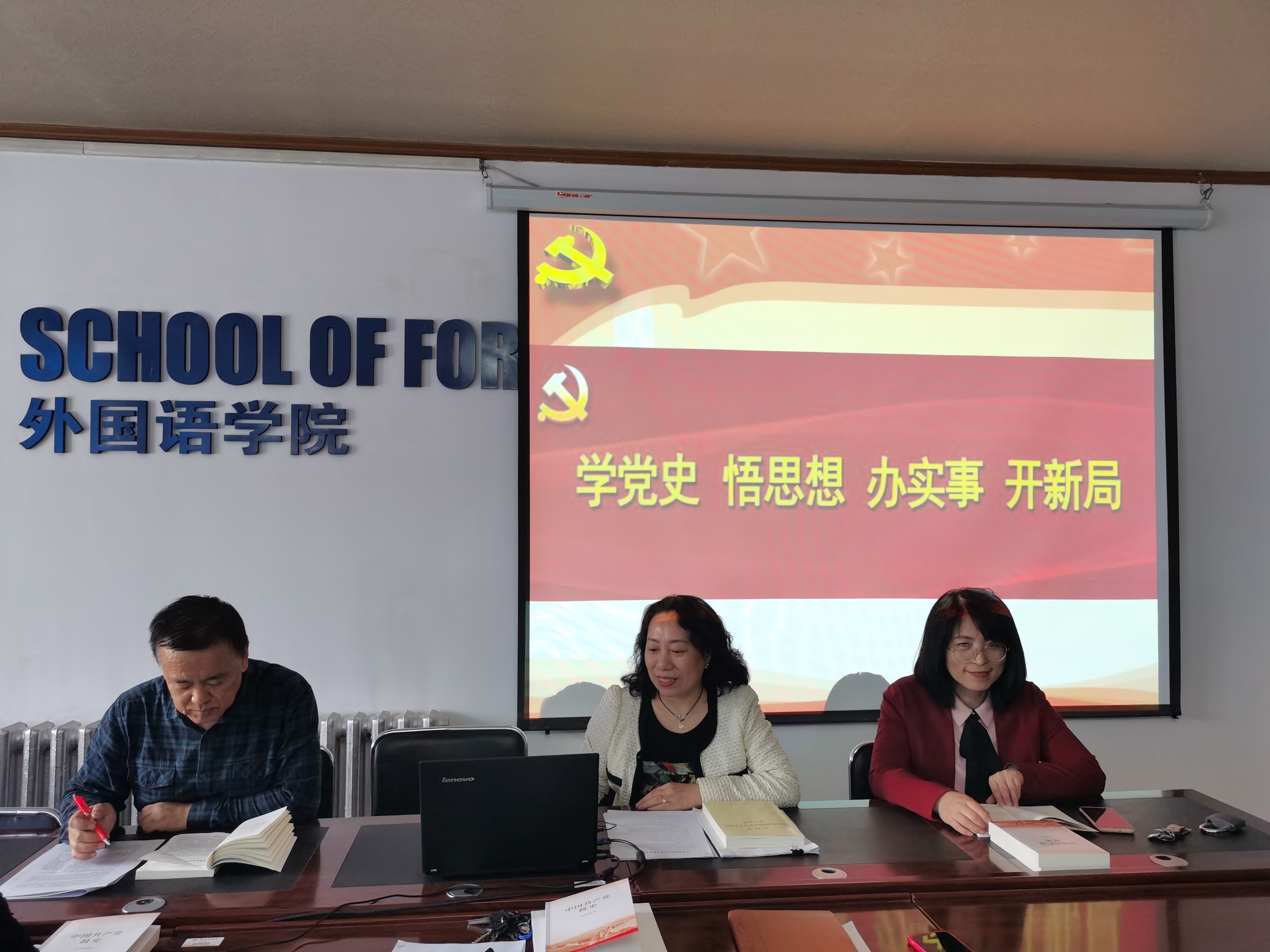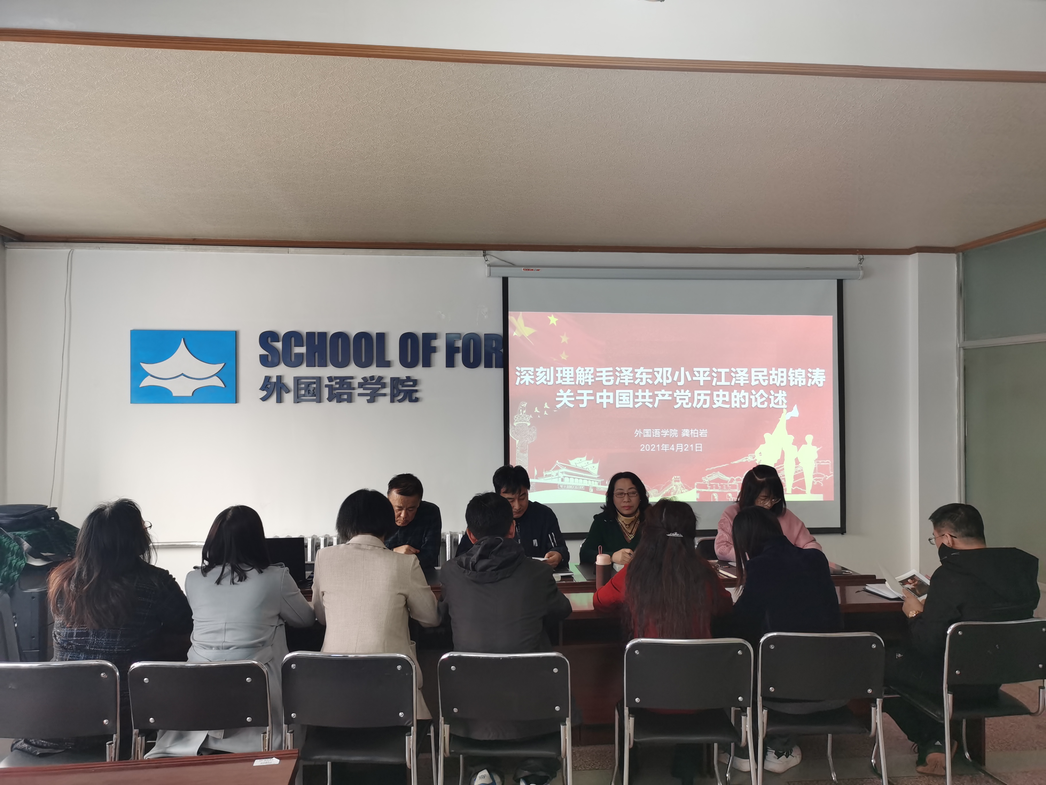 为深入贯彻落实习近平总书记关于学习党史、新中国史的重要指示精神,引导广大党员师生员工知史爱党、知史爱国,进一步坚定“四个自信”,外国语学院党总支自4月16日起至4月21日,组织党史学习教育领导小组成员在学院会议室开展了“学党史 悟思想 办实事 开新局”党史学习教育。