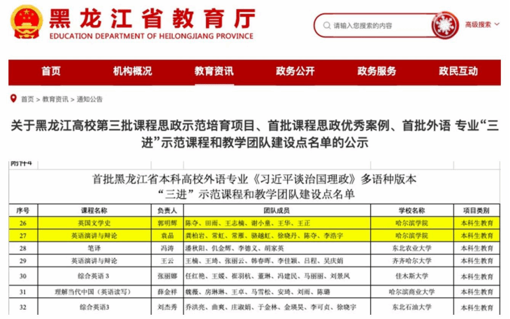 2022年,为落实《黑龙江省普通本科高校外语专业〈习近平谈治国理政〉多语种版本“三进”教学工作实施方案》,外国语学院推进英语专业、俄语专业和商务英语专业的读写课程、翻译课程和演讲课程的“三进”示范课程和教学团队建设。郭明辉老师主持的《英国文学史》和袁晶老师主持的《英语演讲与辩论》被评选为首批黑龙江省本科高校外语专业《习近平谈治国理政》多语种版本“三进”示范课程和教学团队建设点。