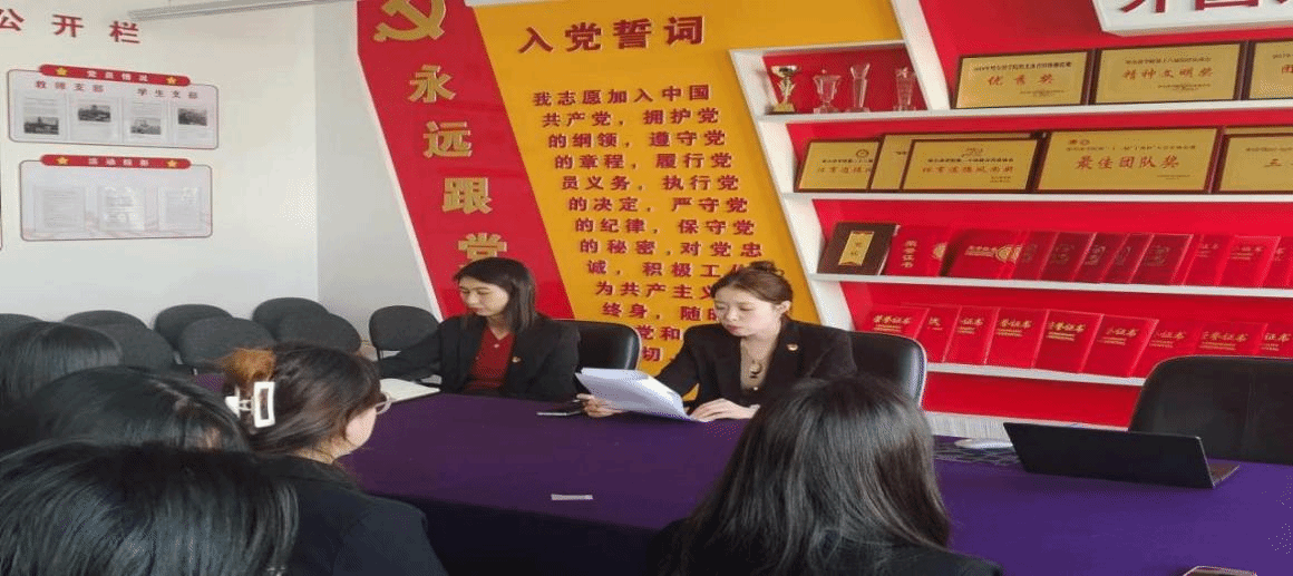 会议伊始,由万惠媛同志宣读预备期转正申请,汇报了自己在学习上认真刻苦,成绩优异,积极帮助班级同学答疑解难;生活中,严于律己,真诚沟通,主动帮助困难同学;她认识到不仅要在专业领域内追求卓越,更要以身作则,传播正能量,以实际行动践行党员的初心和使命。紧接着,入党介绍人对其在预备期间的表现进行了详细汇报,他们认为无论在学习还是生活中,她始终以共产党员的标准严格要求自己,不断发扬优点,起到了先锋带头作用,认为其符合预备党员转正条件,同意其按期转正。