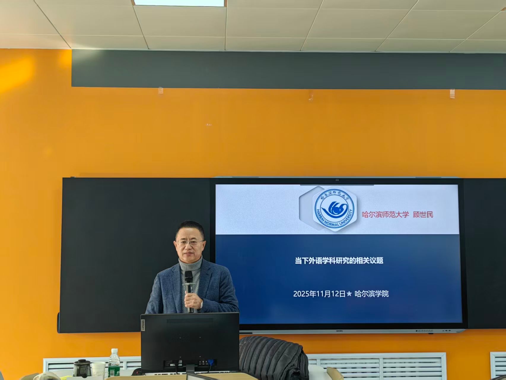 为深入贯彻落实《中共哈尔滨学院委员会知敬畏懂规矩守纪律强教风正学风树校风专项行动工作方案》精神,精准提升科研素养、赋能教学创新,11月12日下午,在科技处统筹指导下,外国语学院在1501室成功举办了主题为“当下外语学科研究的相关议题”的学术报告会,暨“外语之声”学术论坛系列讲座第42讲。特邀哈尔滨师范大学西语学院院长、二级教授、博士生导师顾世民担任主讲,为全院教师带来一场前沿、深刻且富有启发性的学术盛宴。
