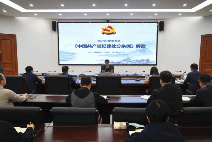 (文/常征、袁新宇)5月15日下午,校长、党委副书记于成学以《<中国共产党纪律处分条例>解读》为题,深入联系学院和所在支部讲授党纪学习教育专题党课。他强调,要深入学习贯彻习近平总书记关于党纪学习教育的重要讲话和重要指示批示精神,原原本本学《中国共产党纪律处分条例》,推动党纪学习教育往深里走、往心里走、往实里走,为推动学校跨越式高质量发展提供坚强纪律保障。