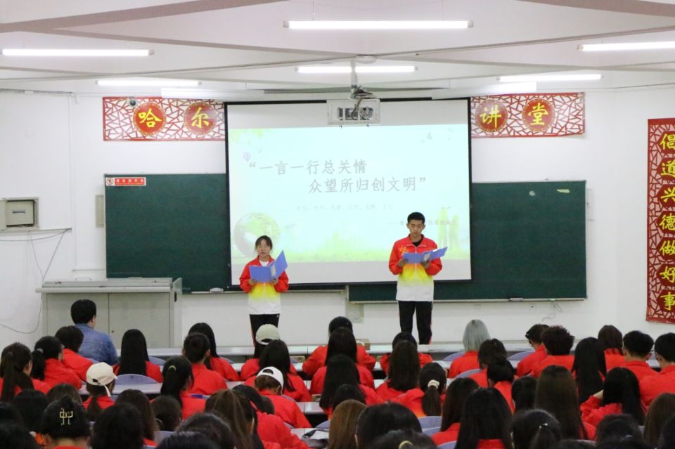 活动伊始,本次活动主持人王昌旭和唐怡同学讲述“文明生活”理论知识,带领同学们深入学习了习近平总书记关于加强社会主义精神文明建设的重要指示精神。同时,通过讲述典型范例,让同学们了解身边的文明与不文明现象。在“讲故事,铭精神”环节中,王霖同学向大家讲述《列宁让路》的故事,通过具体事例,让同学们知道一个文明的习惯对日常生活的影响,让大家在听故事中学会文明和礼让。随后,全体学生合唱歌曲《微笑说你好》将活动氛围推向高潮,通过观看文明礼仪短片,学习文明健康的生活方式。在“谈感悟、送祝福”环节中,同学们纷纷举手发言,表示会从身边小事做起,从自己做起,争当文明青年。最后全体同学诵读《文明礼仪承诺书》,引导同学们牢固树立文明意识,积极参与文明城市建设,争做文明人,共同爱护我们的家园。