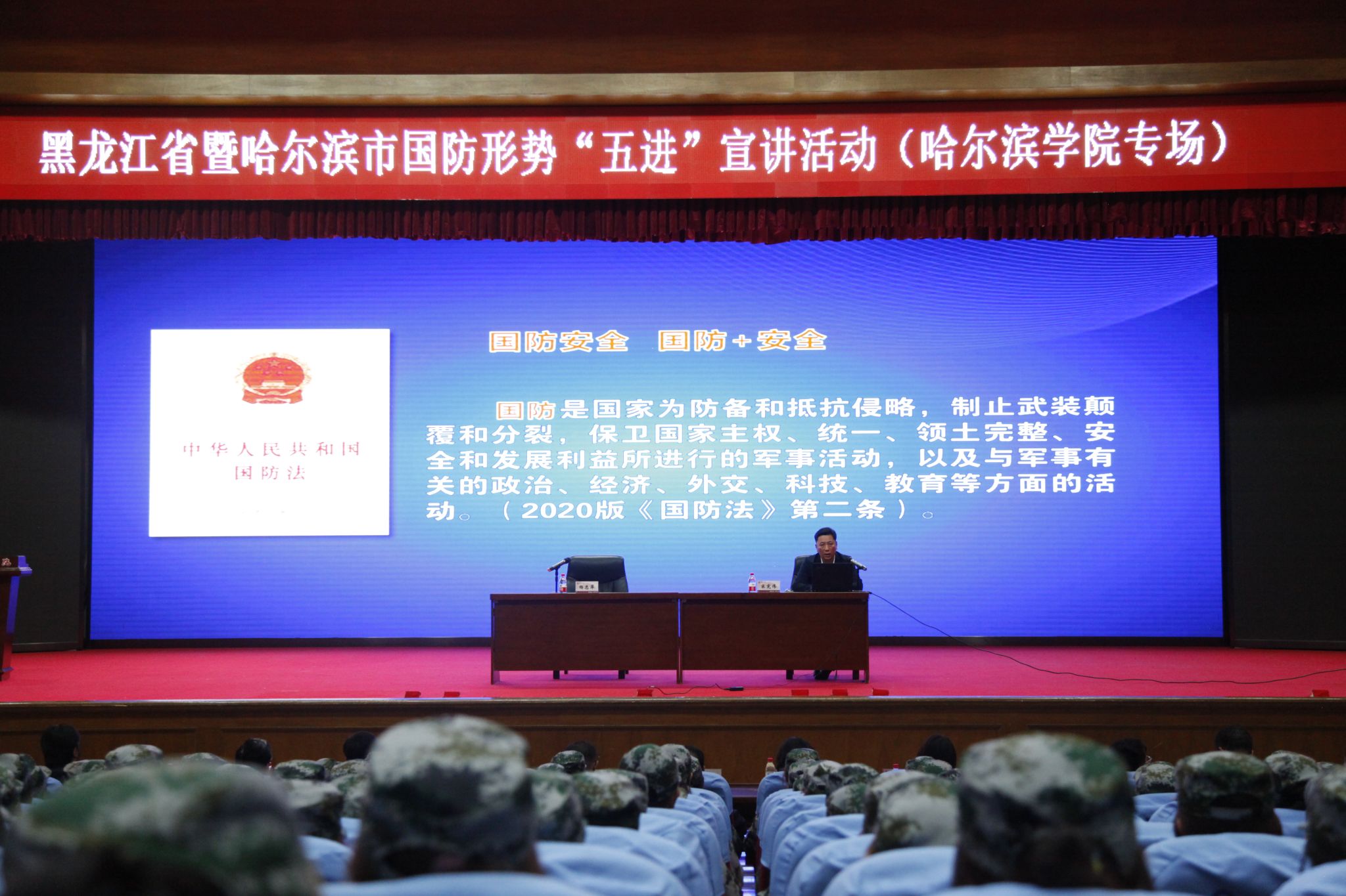 (文/邢珺)为深入贯彻落实“踔厉奋发强国防 勇毅前行向复兴”全省全民国防教育月宣传教育活动要求,9月16日上午,黑龙江省暨哈尔滨市全民国防教育月集中示范活动在我校举办。省委宣传部副部长迟宝旭、省国动办副主任陈文利、市委宣传部副部长杨忠萍、市政府督学吴琼,学校党委书记苍松、党委副书记李娜、副校长吴旭峰出席活动。省委宣传部、省委军民融合办、省教育厅、省国动办、省军区、市委宣传部、哈尔滨警备区,学校党委宣传部、学生处(武装部)、图书馆相关人员及2023级部分新生参加活动。