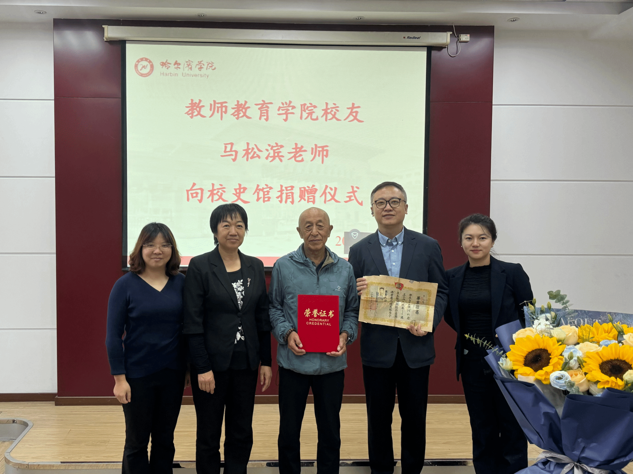 2024年9月25日,马松滨向校史馆捐赠了其父亲马长庆先生(我校早期校友及教职工)的哈尔滨行知师范学校毕业证书、哈尔滨师范学校工作证等珍贵史料。这些史料真实记录了马长庆先生与学校的渊源,这些实物资料是学校早期历史的见证,对丰富校史馆馆藏、研究学校发展历程具有重要价值。