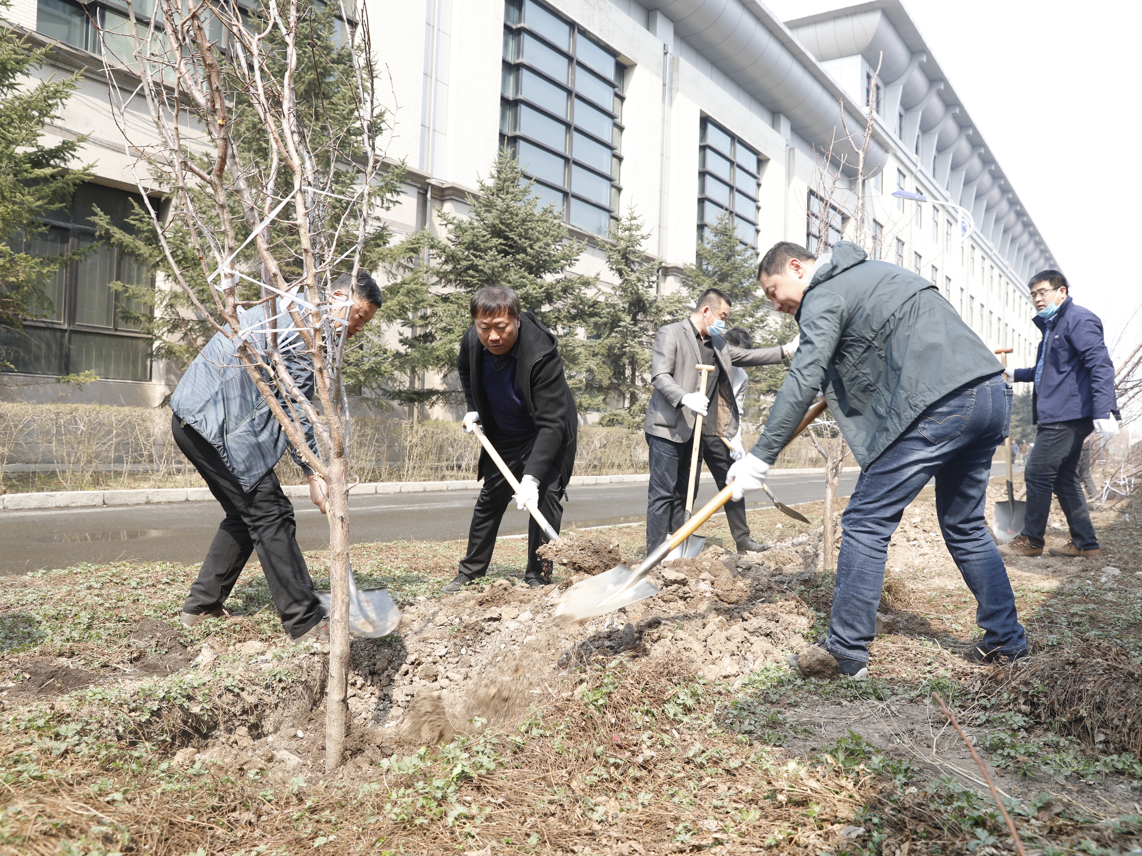全体人员先后来到主校区前广场、图书馆报告厅周边绿化区域,校领导班子成员和参加活动的党员干部们三人一组分工合作,挥锹铲土,扶苗回填,培土围堰,提水浇灌……大家热情洋溢,干劲十足,每一处鸟雀啁啾的枝桠,都回荡着植绿时光的喜悦,阳光下、春风里,一幅忙碌而有序的劳动景象。大家齐心协力栽种的数十株花楸树错落有致,一排排山杏在校园边防“安家落户”,新栽的小树苗昂然挺立,展现着蓬勃生机。