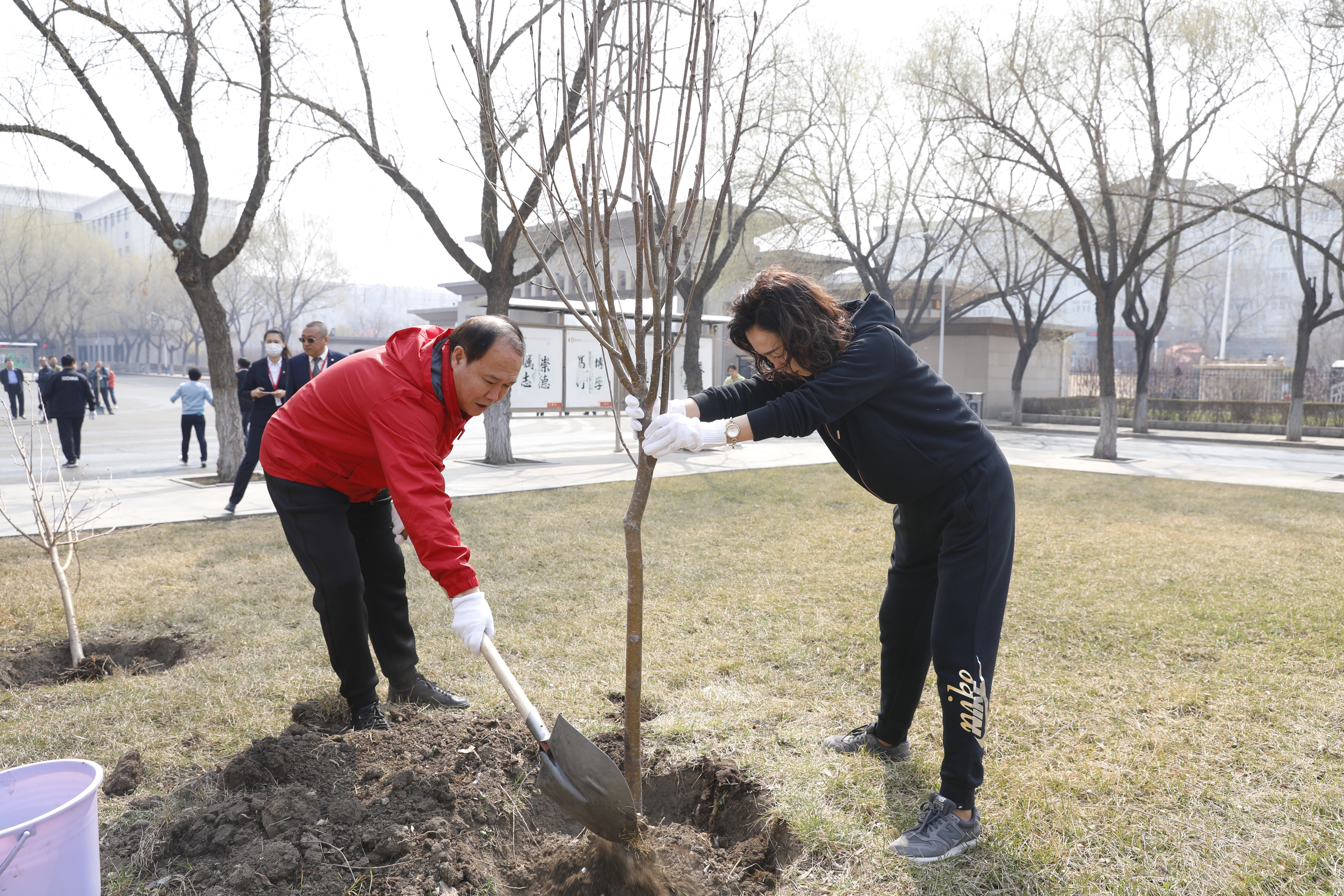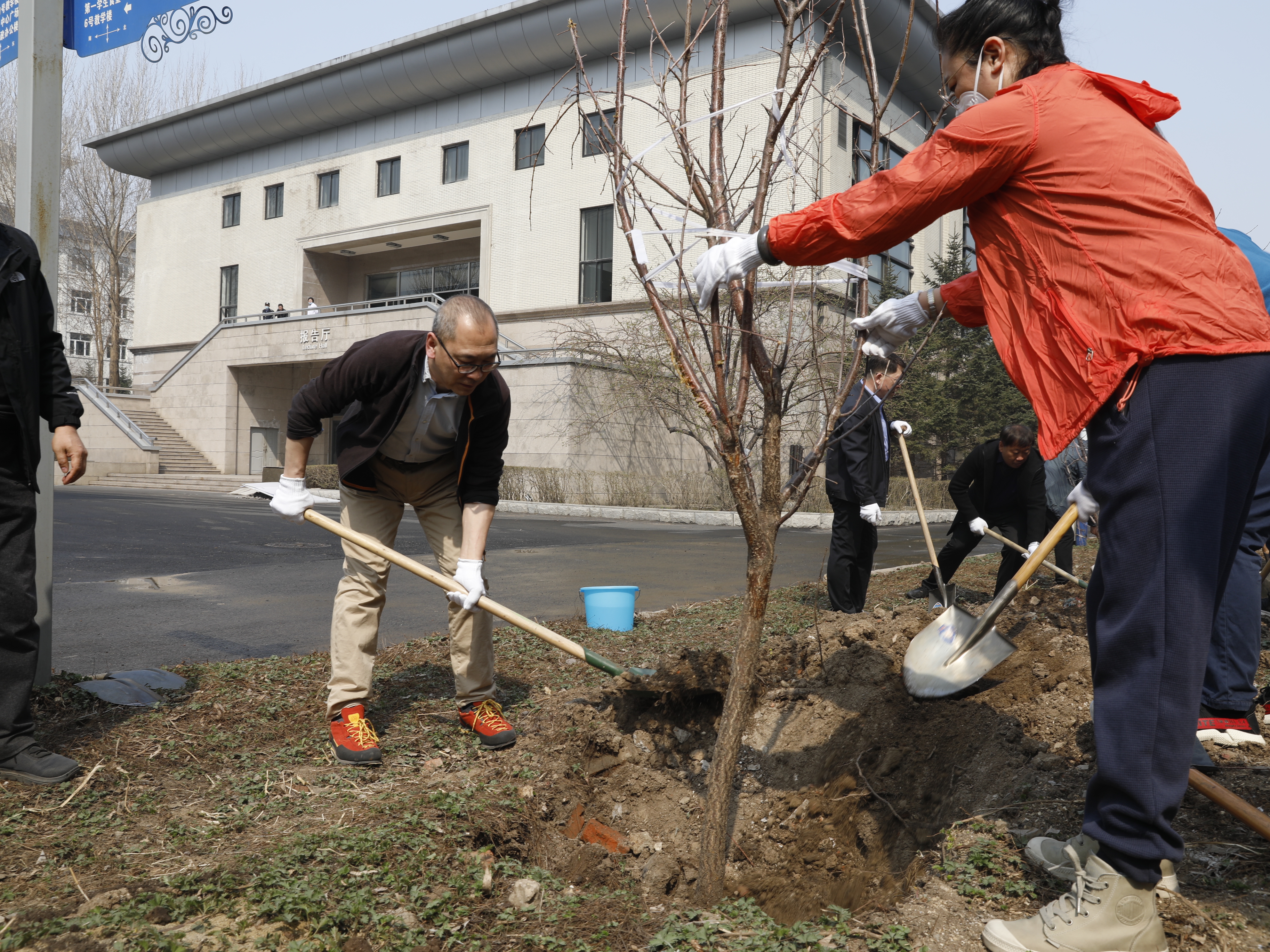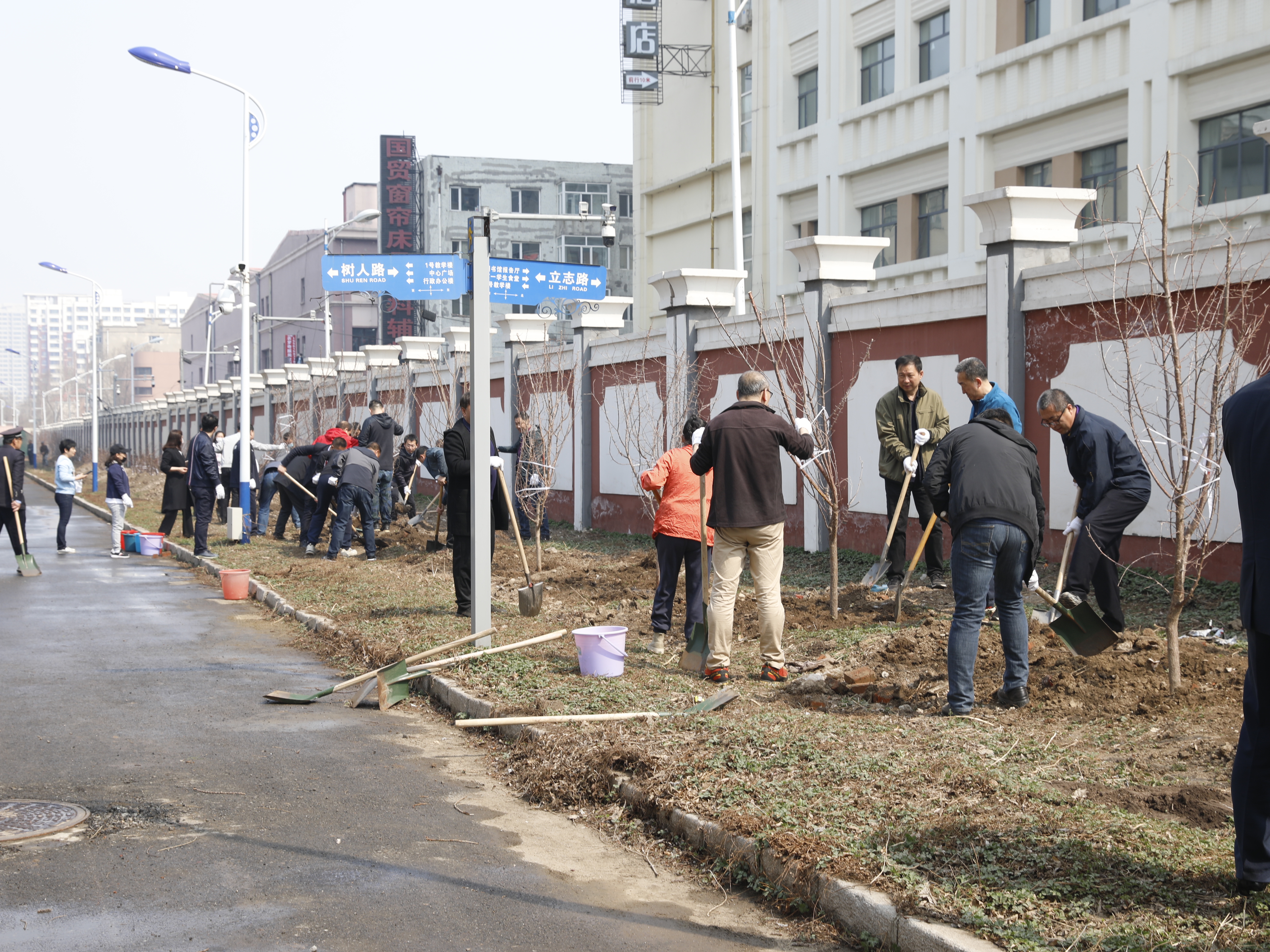 校党委书记冯延平、副校长孙红镱、纪委书记马弘莉、副校长宋国利、工会主席陈威、副校长于少鹏、副校长吴旭峰以及宣传部、组织部、党政办公室、纪检监察室、人事处、学生处、后勤管理处班子成员、园林科职工、物业公司员工一道参加了此次义务植树活动。