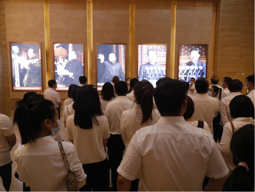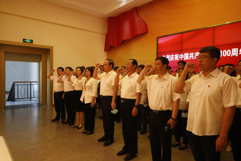 在誓言厅,全体党员面对鲜红的党旗,举起右手,庄严宣誓,重温入党誓词,铭记初心使命。