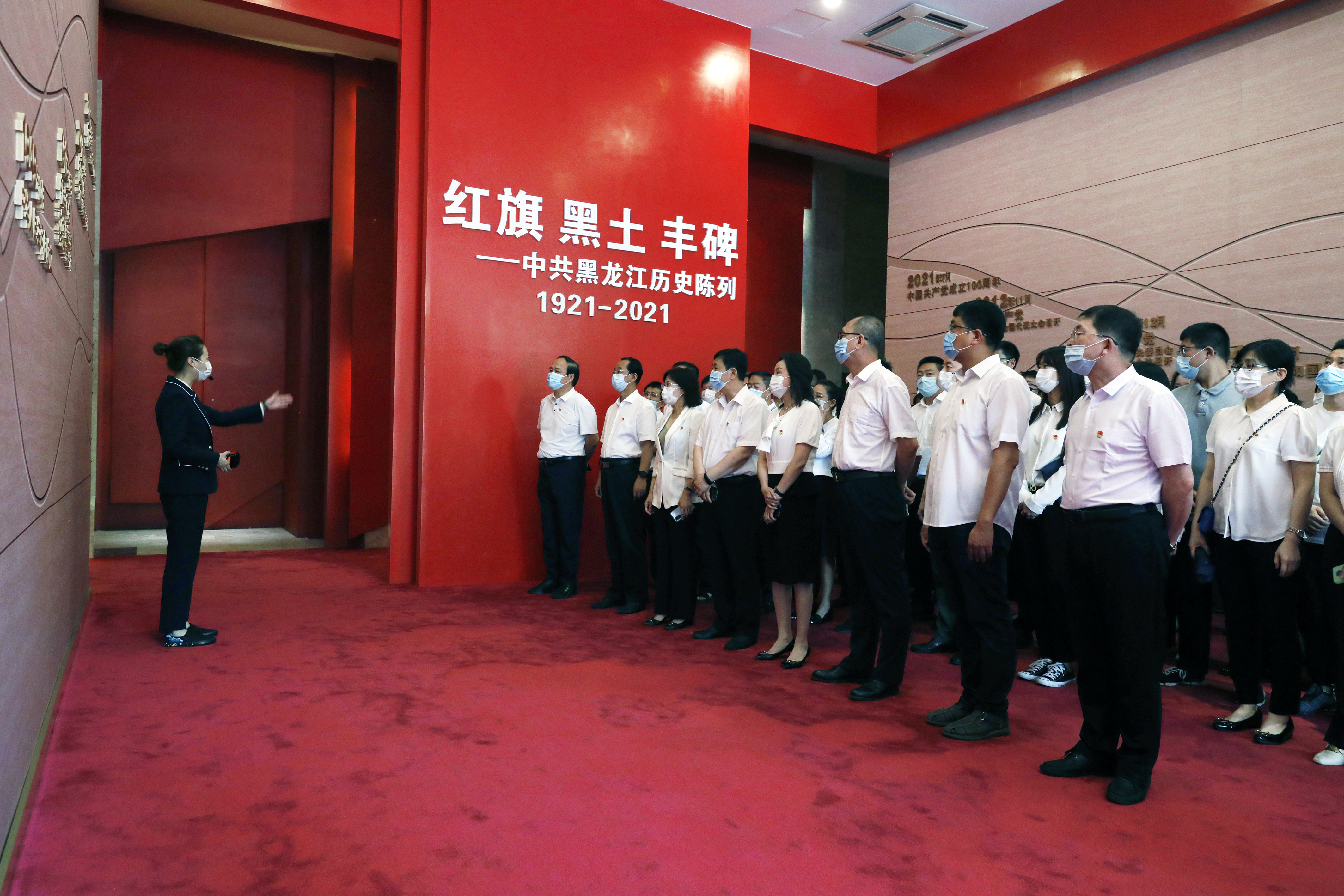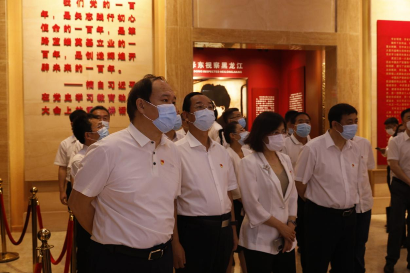 中共黑龙江历史纪念馆以《红旗•黑土•丰碑》为主题,设置“亲切关怀、殷切希望”“播撒火种、革命觉醒”“烽火岁月、艰苦卓绝”“自力更生、力创伟业”“改革开放、开拓前行”“砥砺奋进、谱写新篇”“群星璀璨、大爱无疆”等七大板块,全面生动展示了党带领黑龙江人民进行革命、建设和改革开放的光辉历程。在讲解员的引导下,一件件实物、一张张图片、一个个场景,再现了革命历史画卷。全体党员干部不时驻足交流,仔细观看展览,认真听取讲解,交流学习心得,共同回顾党的创始人和早期领导人艰苦卓绝的光辉事迹,详细了解党组织的建立和发展历程,深刻领会党领导东北军民浴血奋战建立民主政权、进行社会主义建设,取得改革开放和振兴龙江发展的历史性成就。
