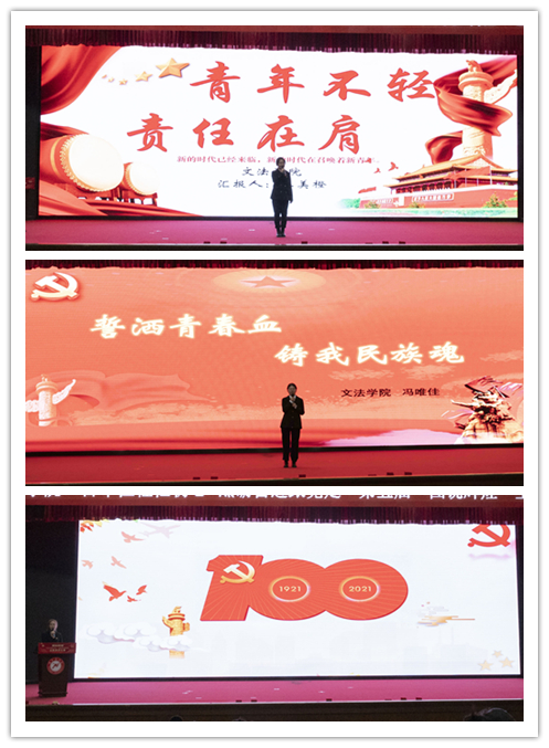 为庆祝中国共产党成立100周年,深入贯彻落实习近平总书记在党史学习教育动员大会上的重要讲话精神,讴歌中华民族实现伟大复兴的奋斗历程,颂扬中国共产党的丰功伟绩,持之以恒发扬党的光荣传统和优良作风,大力弘扬以爱国主义为核心的伟大民族精神,向纪念建党百年献礼,按照学校党委党史学习教育工作部署,2021年6月16日,学校成功举办第五届“图说辉煌”主题演讲比赛。学校党委副书记张鸿雁、工会主席陈威出席活动,党团工作部门负责同志,各二级学院党总支书记、党支部书记,师生党员及入党积极分代表共600余人参加活动。