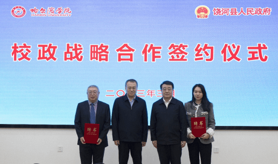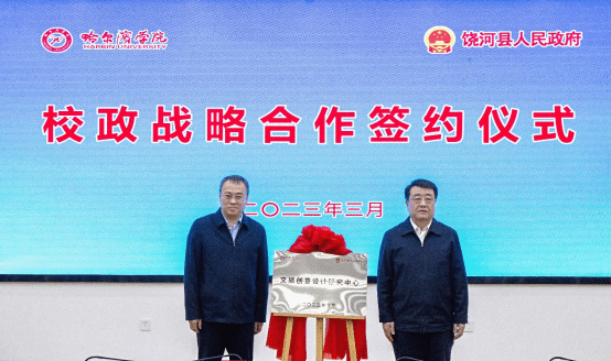 会上,于成学与付殿军代表双方签署了《哈尔滨学院与饶河县政府战略合作协议书》,为合作共建“文旅创意设计研究中心”揭牌,并为研究中心主任曲胜男、王朝晖颁发聘书。