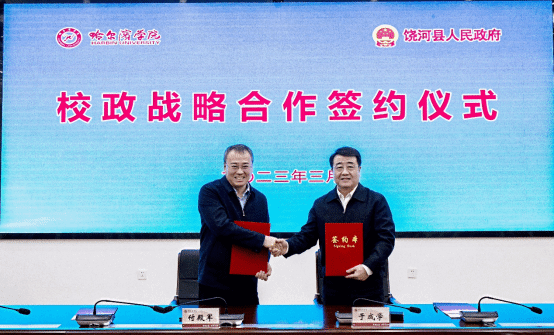 付殿军表示,饶河县与哈尔滨学院签署校政战略合作协议是一件大事和喜事。饶河县历史悠久,文化底蕴厚重,近年来,依托东北黑蜂国家级自然保护区研发种类繁多的蜂产品,通过电商直播基地将饶河土特产、俄罗斯进口商品卖向全国,在发展生物经济、数字经济方面有资源、有基础、有优势。希望通过本次战略合作协议的签署,进一步发挥高等学校学科专业优势和“文旅创意设计研究中心”积极作用,将冰雪旅游和赫哲族鱼皮画、桦树皮画等特色文创产业做大做强,助力饶河县冰雪经济、创意设计经济发展再上新台阶。