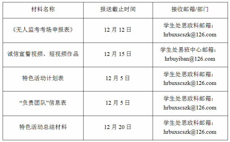 各二级学院结合本学院专业特点与学生实际,突出活动的参与性与实效性,设计开展至少1项特色诚信考试教育活动,例如“诚信备考学习互助小组”“考风考纪辩论赛”“学长学姐诚信经验分享会”等形式。12月5日前将《2025年秋季学期诚信考试特色活动计划表》报送至学生处思政科,活动结束后3个工作日内提交活动总结(含文字材料、图片、视频等佐证资料)。