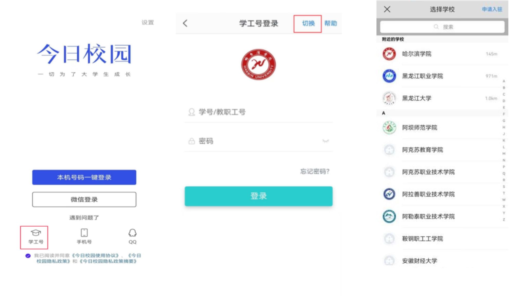 请注意:下载好今日校园后,不要去点【本机号码一键登陆】。先点下方的学工号登陆,登录时需将学校切换为哈尔滨学院。登录后及时修改密码。