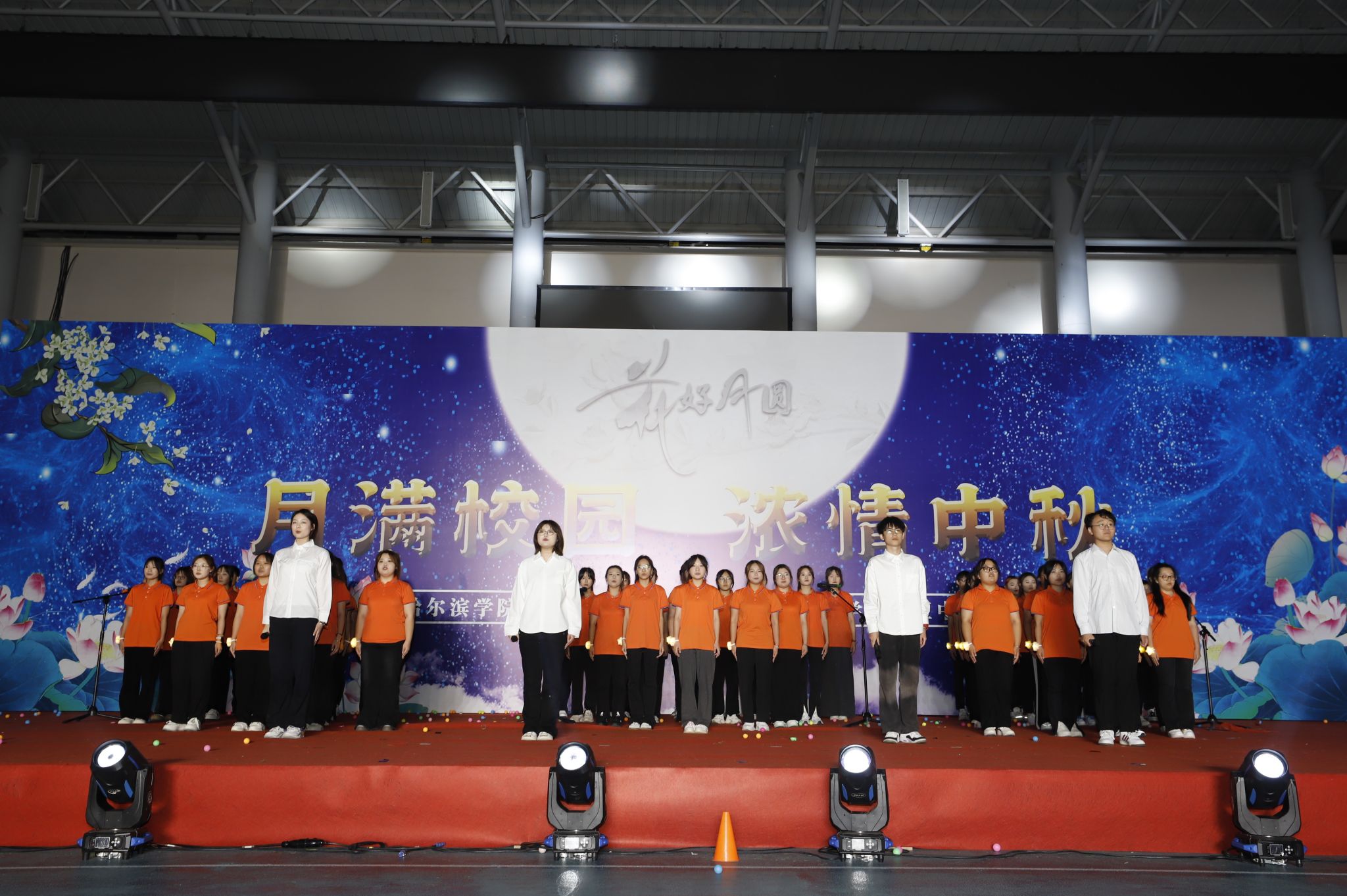 由我校藏族学生带来的民族传统风情舞蹈,一时间将全场观众带到了雪域高原,描绘出的美丽景色和风土人情,展现出了扎根北疆的藏族学子们对冰城的热爱与眷恋。舞蹈表演结束后,于成学上台为所有藏族学生送上亲手制作的月饼,学生们也献上了洁白的哈达。小品《你好!老师》、体育学院带来的武术表演、歌曲串烧、互动环节“谁是我的辅导员”为整场晚会增添了喜庆的节日气氛。