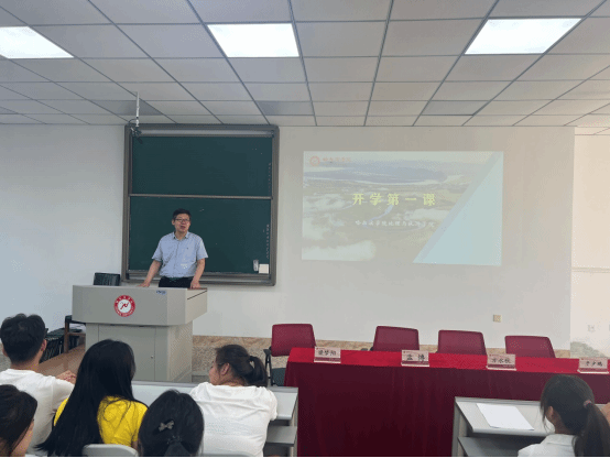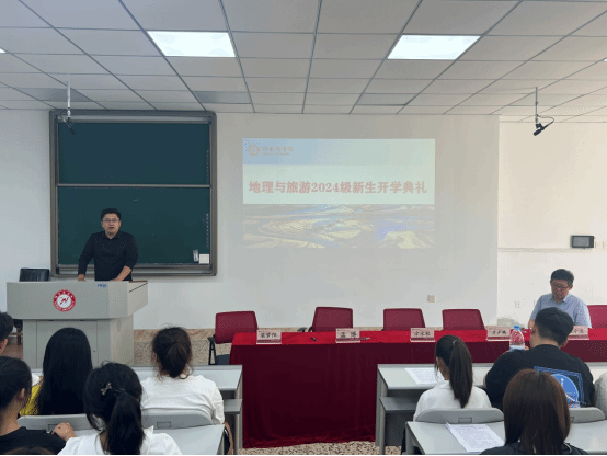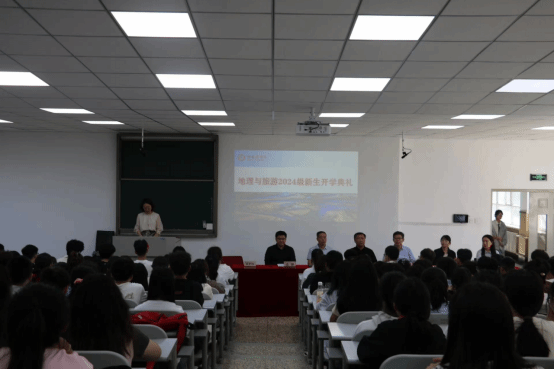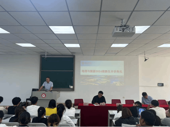 在学校90周年校庆来临之际,地理与旅游学院迎来了2024级218名新生,学院于9月2日下午在8201教室举行地理与旅游学院2024级新生开学典礼暨“开学第一课”。副校长于少鹏,党总支书记方永秋、副院长孟令波、教师代表孟博、教务办主任邱红和学工办主任刘彤出席此次活动,本次活动由辅导员梁梦阳主持,全体2024级新生参加本次活动。