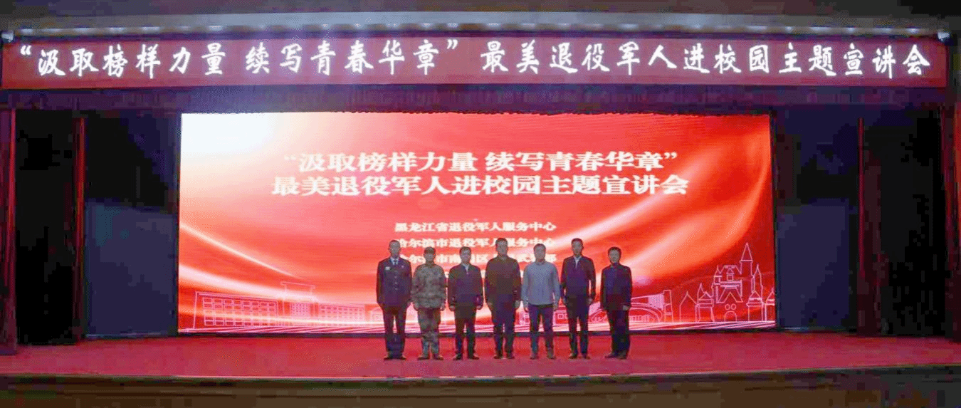 (文/姚来斌)12月4日,我校在图书馆报告厅举办“汲取榜样力量 续写青春华章”最美退役军人进校园主题宣讲活动。校党委副书记李娜,哈尔滨市退役军人事务局党组成员、副局长胡树民,黑龙江省退役军人服务中心主任张德浩、南岗区人民武装部副部长李强,校长助理潘俊豪出席活动。黑龙江省退役军人事务厅相关业务处室同志,省、市退役军人服务中心相关业务部门同志,哈尔滨市“橄榄绿”退役军人志愿者代表,学校各二级学院党委(党总支)副书记、全体辅导员和学生代表参加活动。