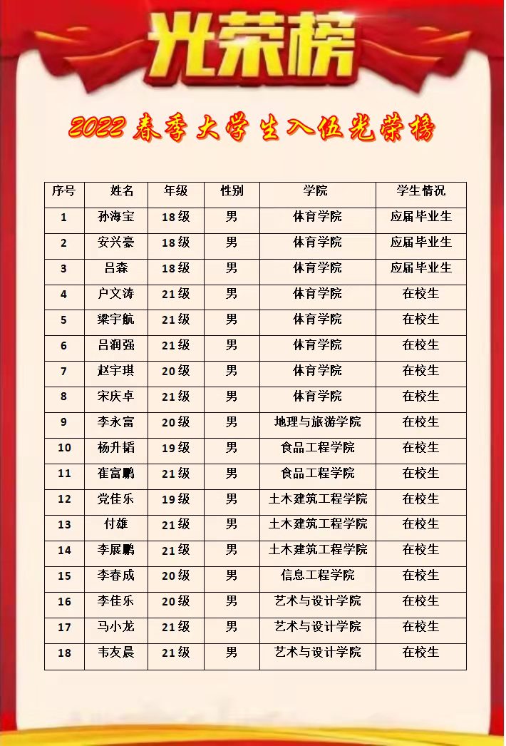 学校通过易班app平台、各学院微信公众号等媒体平台,广泛开展征兵政策宣传。发布“2022春季征兵季”“军营里的青春”等系列网络推送10余篇,累计阅读量超5万余次。