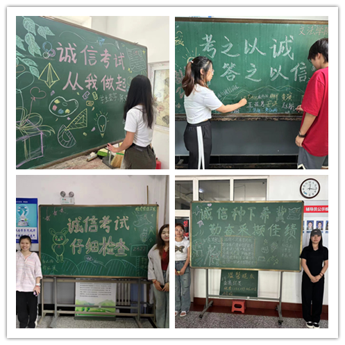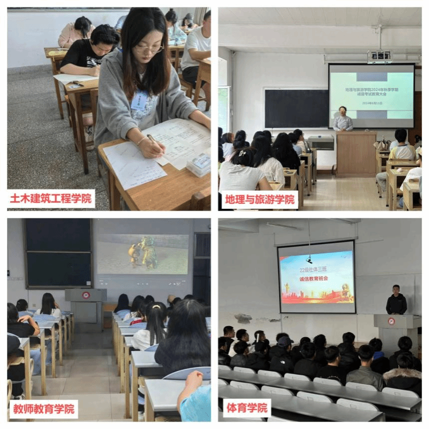 各二级学院按照学生处工作部署,以诚信考试教育大会、签订《诚信考试承诺书》、党团员亮身份等为主渠道,通过多种形式丰富诚信教育载体,提升诚信教育的针对性和影响力。音乐与舞蹈学院开展诚信考试口号征集、地理与旅游学院开展诚信考试校园随机采访、教师教育学院开展诚信观影、经济管理学院开展“携手并进 笃行致远”诚信帮辅、马克思主义学院开展“一诺千金”主题宣讲、食品工程学院开展学生违纪案例警示教育大会、体育学院开展“诚信考试 携手并进”朋辈互助、土木建筑工程学院开展学生干部挂牌应考、外国语学院开展“诚信在我身边”主题班会、文法学院开展“文以载道 诚信为本”主题班会、信息工程学院开展寝室诚信宣讲、艺术与设计学院开展班级诚信口号接龙。