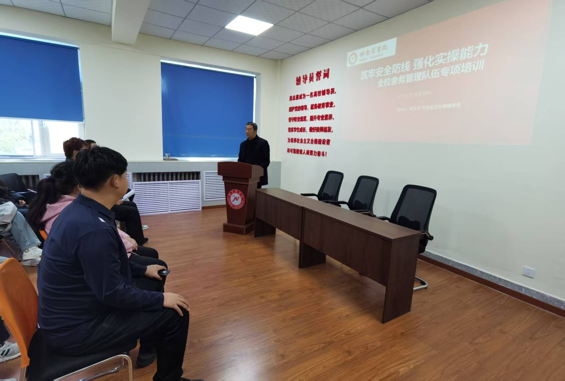 为提升学生公寓管理服务水平,加强舍务干部队伍建设,10月22日,学生处在崇德楼1223室组织开展了以“筑牢安全防线 强化实操能力”为主题的专项培训。全校学生舍务干部及各二级学院学生会生活部部长参加。