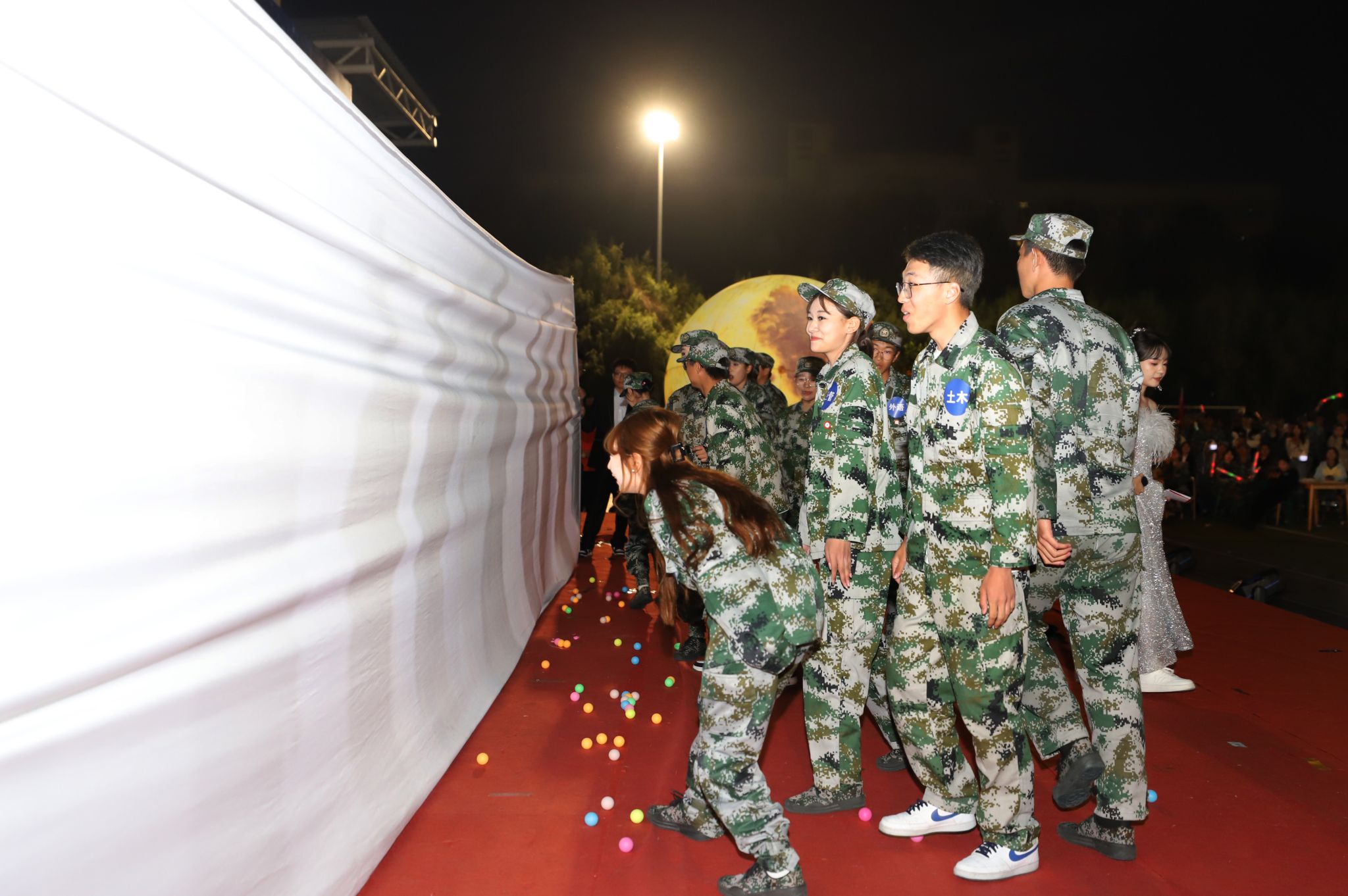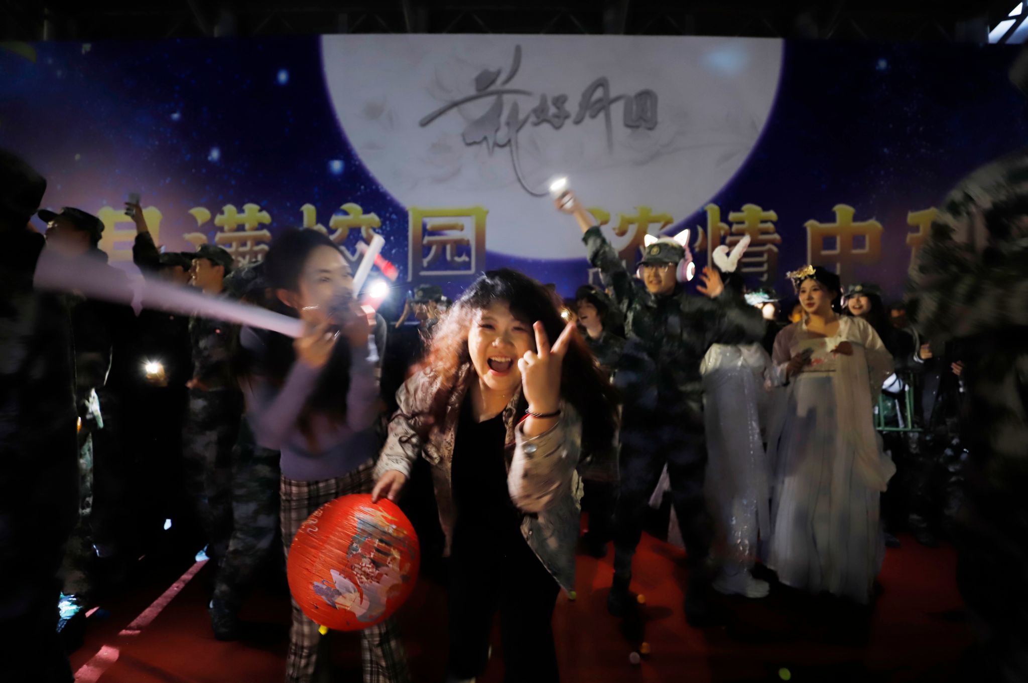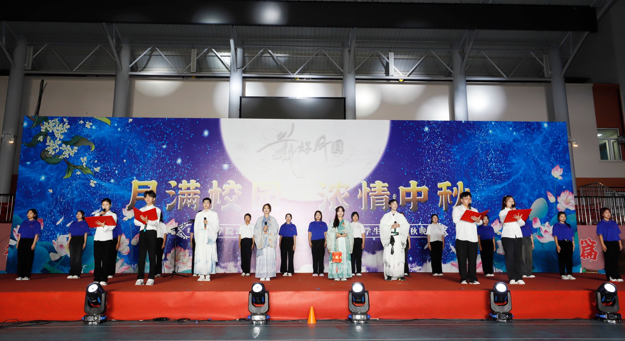 由全体新生辅导员演唱的《但愿人长久》引得全体学生纷纷与辅导员老师互动,将晚会推向高潮。晚会来到第二个互动环节——猜灯谜、说典故,成学校长与同学们对诗,并为全体学生送去了中秋祝福。