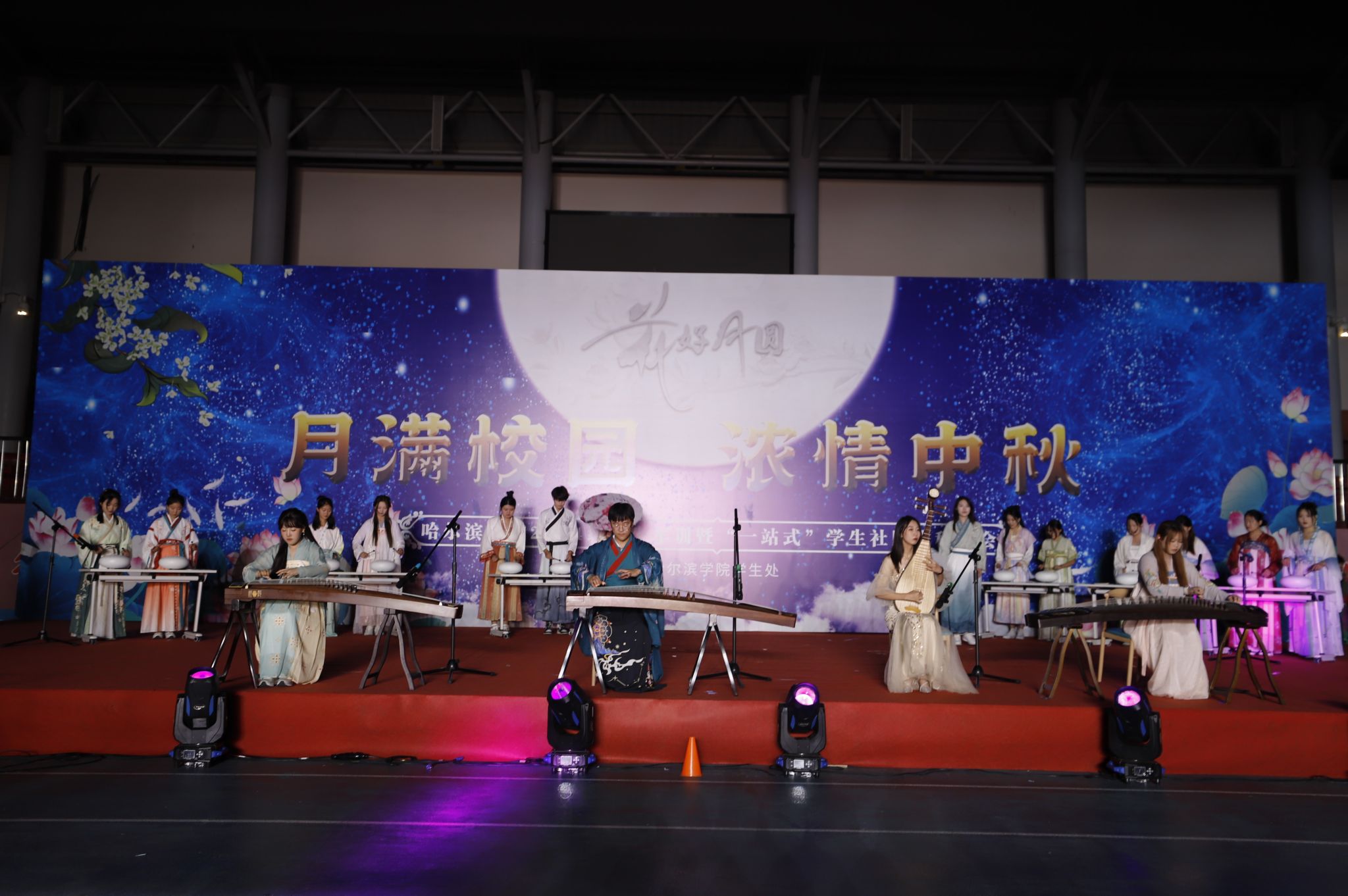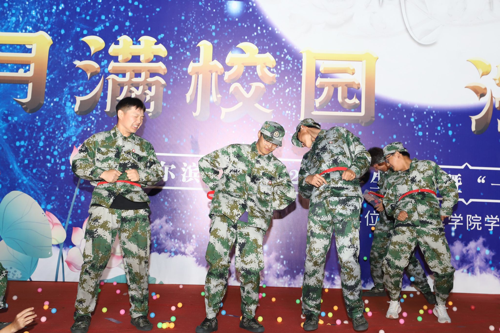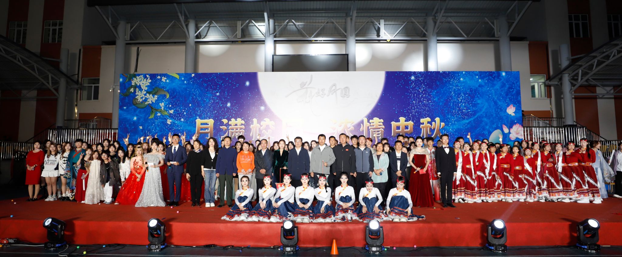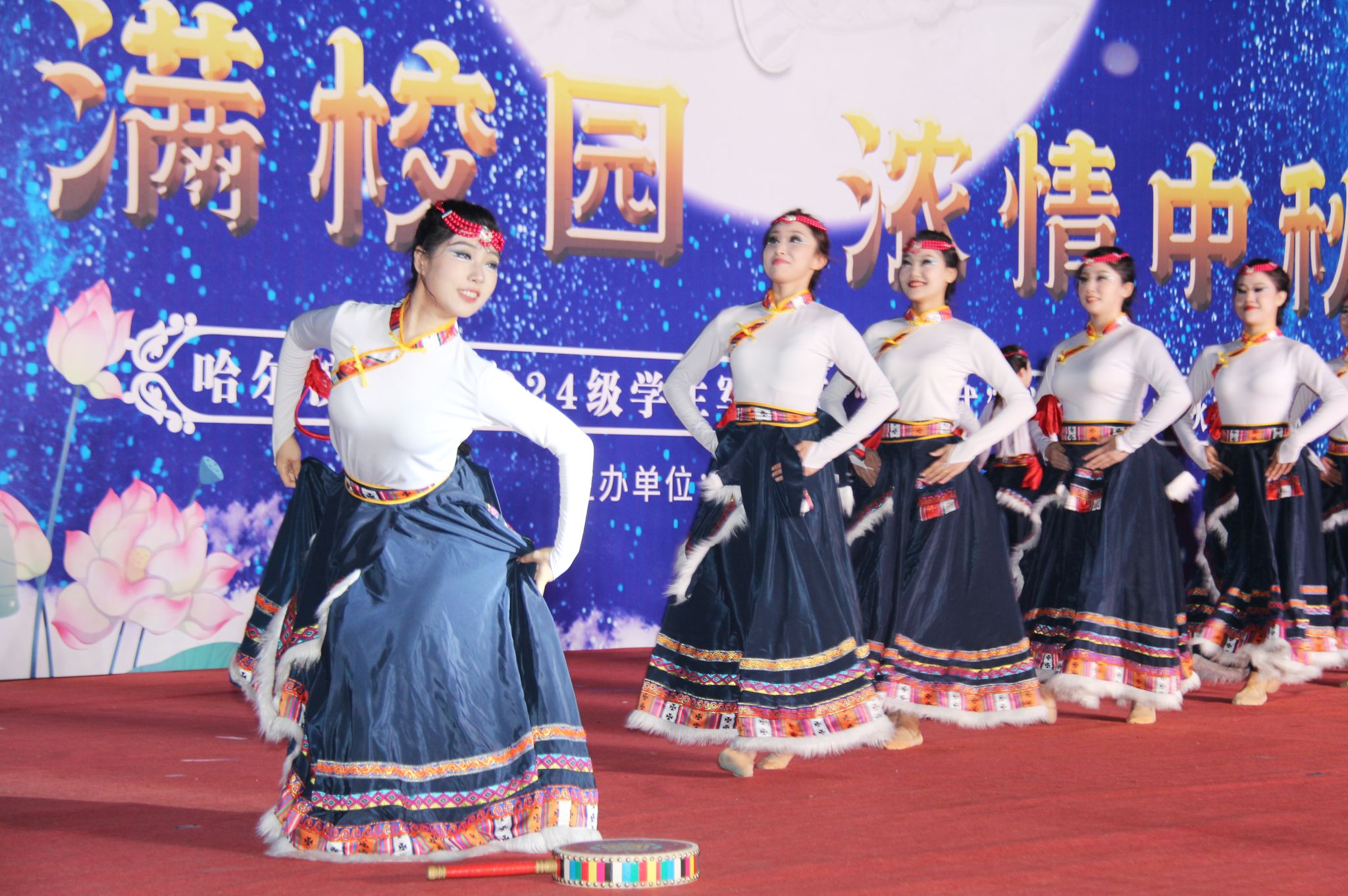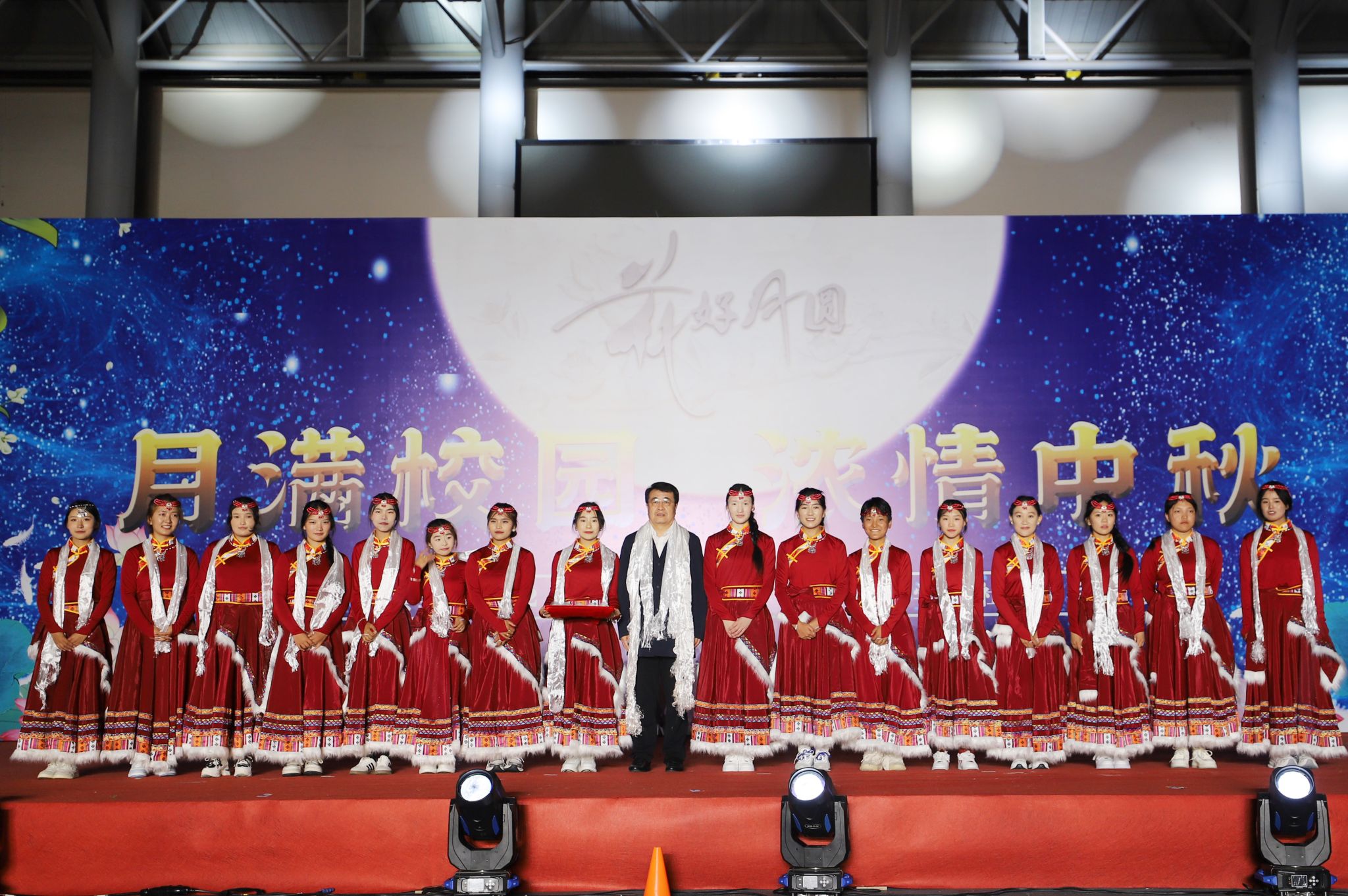 由我校藏族学生带来的民族传统风情舞蹈,一时间将全场观众带到了雪域高原,描绘出的美丽景色和风土人情,展现出了扎根北疆的藏族学子们对冰城的热爱与眷恋。舞蹈表演结束后,于成学上台为所有藏族学生送上亲手制作的月饼,学生们也献上了洁白的哈达。小品《你好!老师》、体育学院带来的武术表演、歌曲串烧、互动环节“谁是我的辅导员”为整场晚会增添了喜庆的节日气氛。